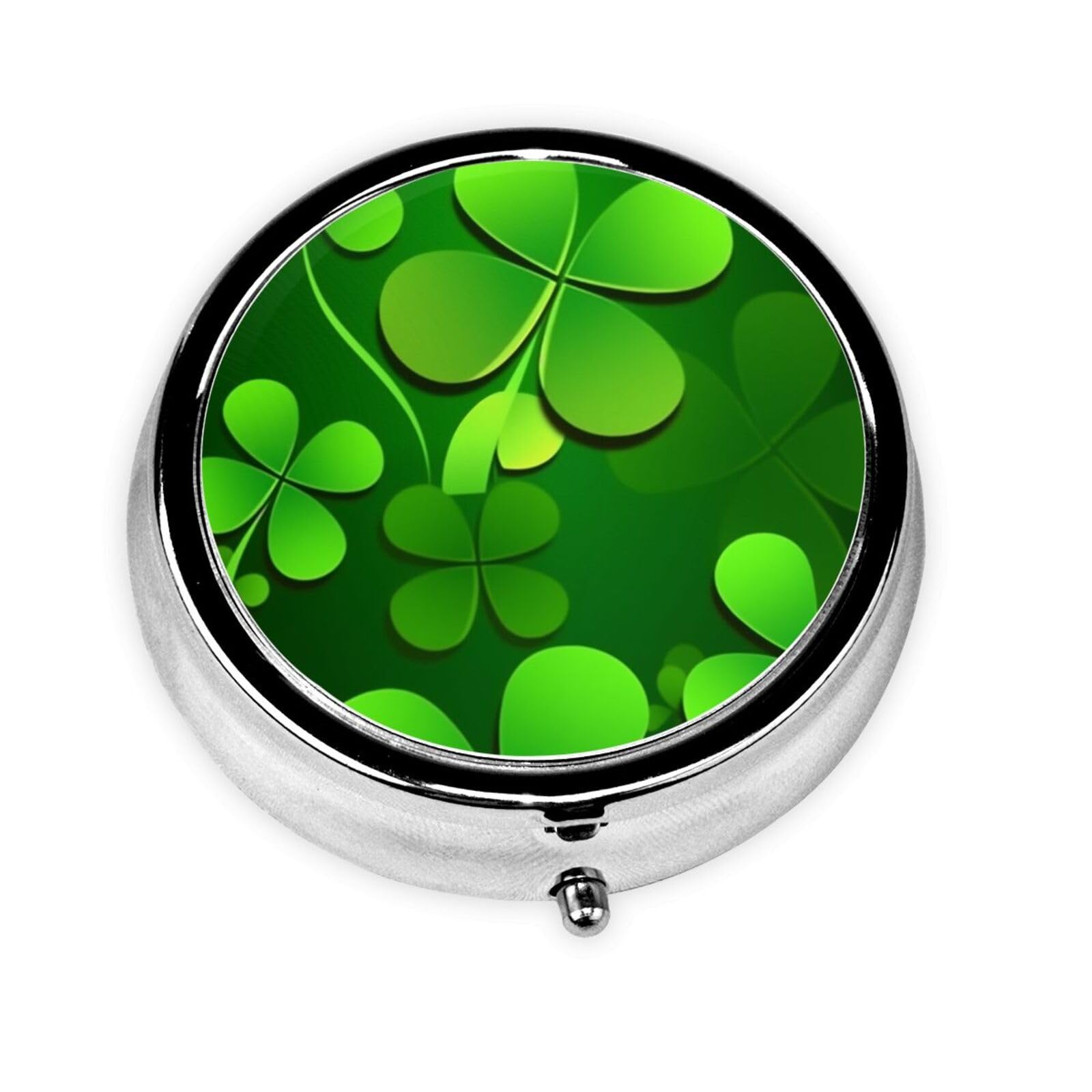 Wide range of applicable scenarios: suitable for use in various occasions such as home, office, and travel, providing you with convenient drug storage solutions. Multi-grid plastic inserts: The medicine box is designed with 3 plastic inserts inside, which can separate and store different types of pills, making them more organized and convenient to use. Convenient opening button design: The medicine box button design is easy to open, convenient and fast, and simple to operate, allowing you to easily access the medicine. Environmentally friendly metal material: Made of environmentally friendly metal iron plating material, it is durable, safe and reliable, and protects medicines from damage. Green four leaf clover Portable mini design: round mini pill box, measuring 2.0x2.0x0.7 inches, lightweight and portable, suitable for carrying in pockets and purses, providing you with urgently needed medicines anytime and anywhere.