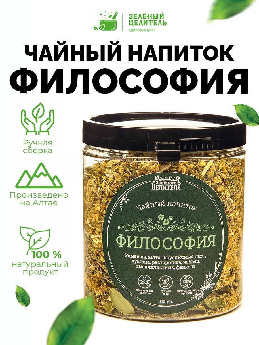 The "Philosophy" tea drink from the "Green Healer" brand is a unique combination of traditional ingredients, designed for lovers of a natural and healthy lifestyle. This tea drink is distinguished by its rich composition, which includes chamomile, mint, lingonberry leaf, oregano, milk thistle, thyme, yarrow, and fennel.