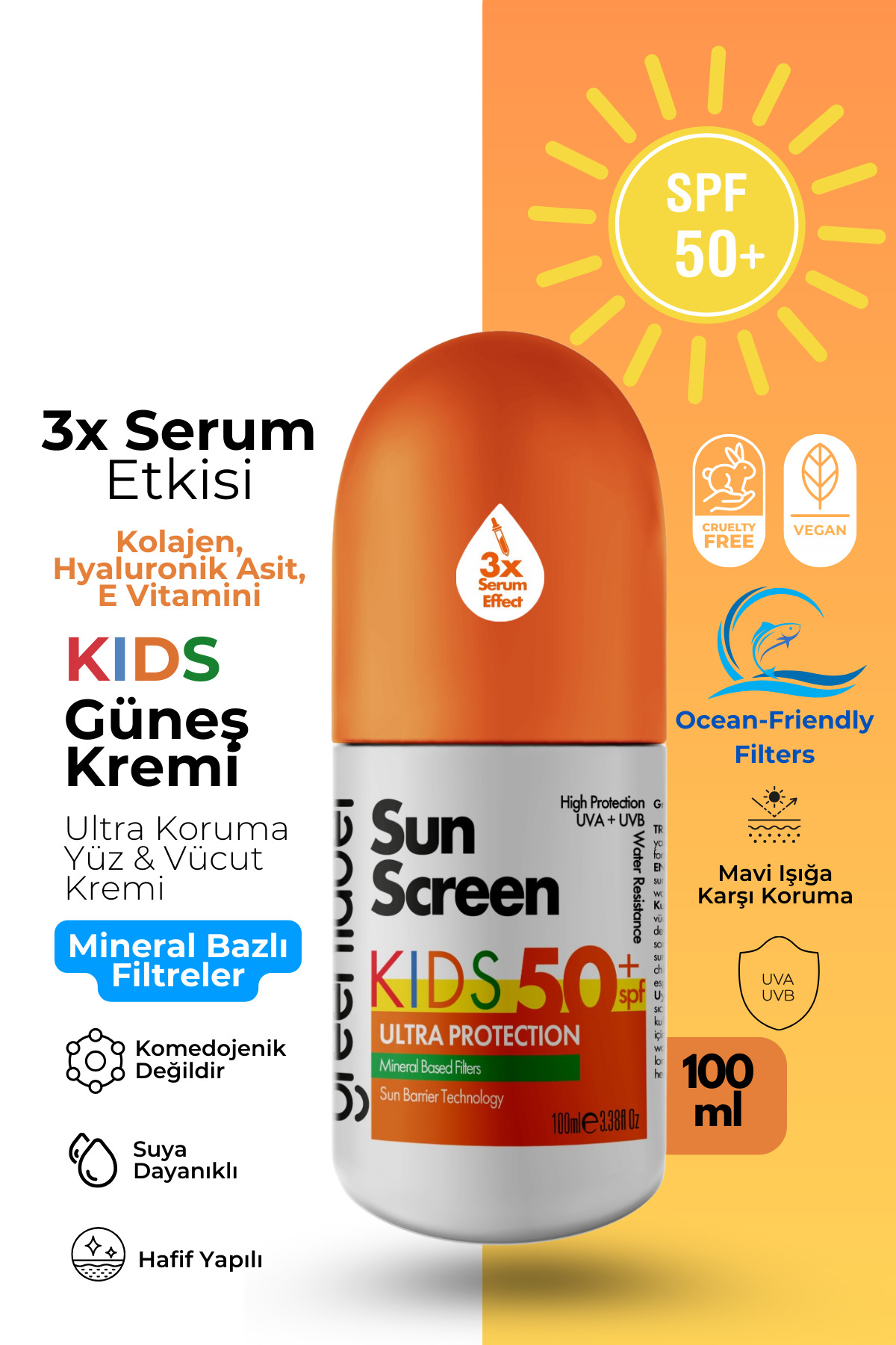 Greenlabel 50SPF Çocuk Yüz ve Vücut Günes Kremi, çocuklarin hassas cildini günesin zararli UVA ve UVB isinlarina karsi korumak için özel olarak formüle edilmis yüksek koruma saglayan bir günes kremidir. Panthenol ve E Vitamini içerigiyle cildi beslerken suya dayanikli özelligi sayesinde yüzme veya su aktiviteleri sirasinda bile koruma saglar.