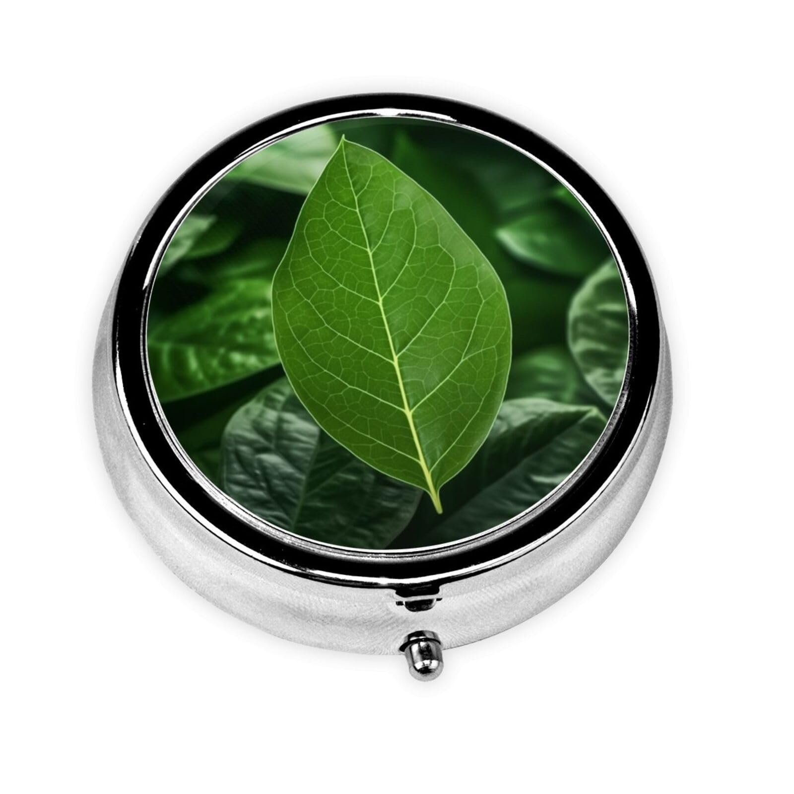 Wide range of applicable scenarios: suitable for use in various occasions such as home, office, and travel, providing you with convenient drug storage solutions. Multi-grid plastic inserts: The medicine box is designed with 3 plastic inserts inside, which can separate and store different types of pills, making them more organized and convenient to use. Convenient opening button design: The medicine box button design is easy to open, convenient and fast, and simple to operate, allowing you to easily access the medicine. Environmentally friendly metal material: Made of environmentally friendly metal iron plating material, it is durable, safe and reliable, and protects medicines from damage. Green Leaf Nature Portable mini design: round mini pill box, measuring 2.0x2.0x0.7 inches, lightweight and portable, suitable for carrying in pockets and purses, providing you with urgently needed medicines anytime and anywhere.