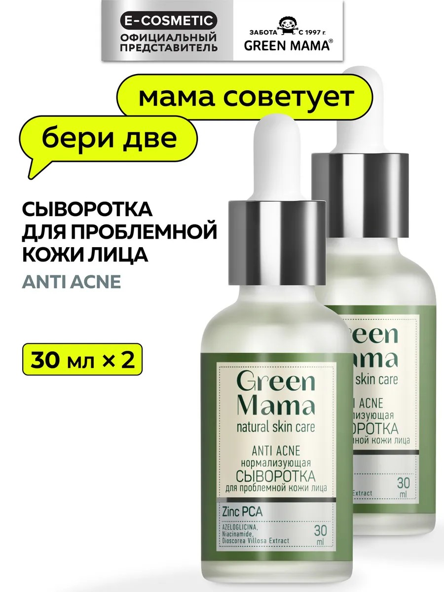 В состав набора входит: Сыворотка для лица GREEN MAMA нормализующая ANTI ACNE для проблемной кожи 30 мл - 2 шт. Сыворотка разработана для комплексного ухода за жирной и склонной к высыпаниям кожей. Лёгкая текстура быстро впитывается, не оставляя жирного блеска, и направленно действует на причины несовершенств.