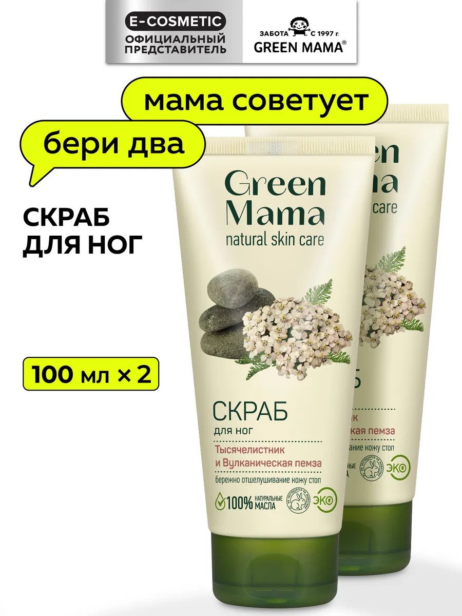 With regular use, it helps maintain cleanliness and neatness without the need for frequent professional pedicures. HOW TO USE: Soak your feet in hot water. Apply the scrub to damp feet, massage for five minutes, then rinse with cool water. Ideal for use with foot cream. Recommended for rough areas of skin (elbows, feet, knees). E-COSMETIC is the official supplier of GREEN MAMA.