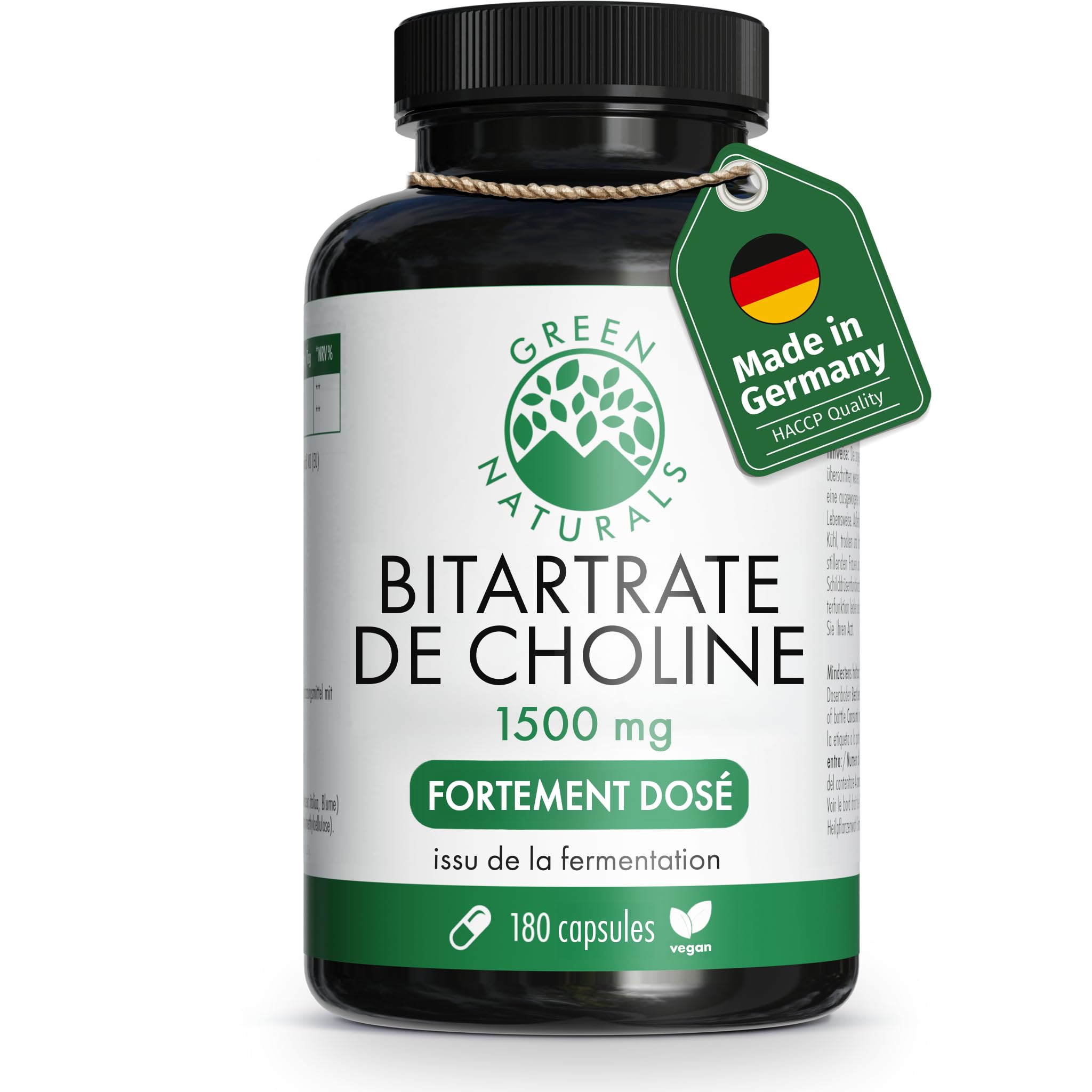 Superior quality from Germany: Lab-tested and manufactured in Germany according to HACCP standards. The current lab certificate can be found in the "Safety and Product Resources" section. Purity Tolerance: Our vegan capsules are free from magnesium stearate, microcrystalline cellulose, flavorings, colorings, gelatin, and preservatives. They are gluten-free, soy-free, and 100 non-GMO. 180 capsules - 3-month supply: With 180 capsules per box, the product offers a convenient 3-month supply – ideal for anyone who values ??consistent and easy intake. Scientifically confirmed (EFSA): Choline contributes to normal fat metabolism and the maintenance of normal liver function . High-dose choline capsules: each daily dose contains 1,500 mg of choline bitartrate, of which 40 is pure choline from fermentation – with no animal-derived components, purely plant-based.Qualité supérieure en provenance d'Allemagne: testé en laboratoire et fabriqué en Allemagne selon les normes HACCP. Le certificat de laboratoire actuel peut être consulté dans la section « Ressources sur la sécurité et les produits ». Pureté tolérance: nos gélules végétaliennes sont exemptes de stéarate de magnésium, de cellulose microcristalline, d'arômes, de colorants, de gélatine et de conservateurs. Elles ne contiennent ni gluten ni soja et sont 100 sans OGM. 180 gélules - 3 mois d'approvisionnement : avec 180 gélules par boîte, le produit offre un approvisionnement pratique pour 3 mois - idéal pour tous ceux qui attachent de l'importance à une prise régulière et simple. Confirmé scientifiquement (EFSA): la choline contribue à un métabolisme normal des graisses et au maintien d'une fonction hépatique normale . Gélules de choline hautement dosées: chaque dose quotidienne contient 1.500 mg de bitartrate de choline, dont 40 de choline pure issue de la fermentation – sans composants d'origine animale, purement végétale.Green Naturals Choline Bitartrate – Hautement dosées: 1.500 mg de bitartrate de choline issu d'une fermentation naturelle – Pour le foie et le métabolisme des graisses (EFSA) – 180 gélules