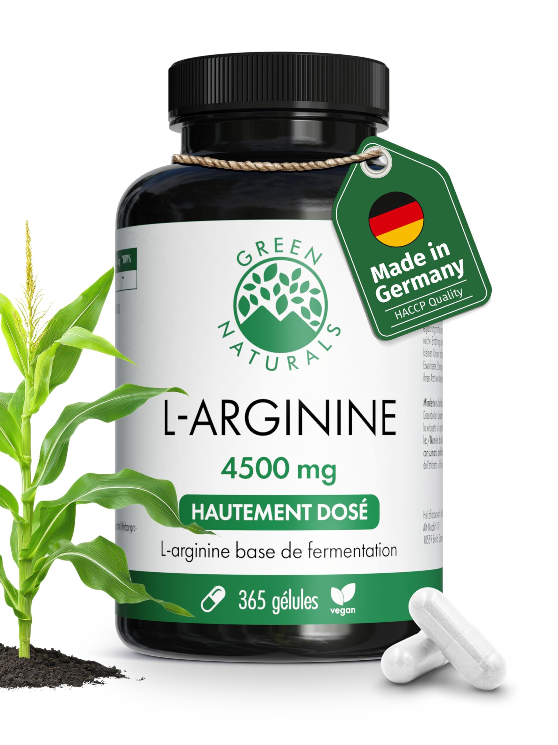 Green Naturals L-Arginine Hautement dos e 4 500 mg par dose journali re L-arginine base pure issue de fermentation naturelle 100% v g talienne & sans additifs 365 g lules (60 jours)