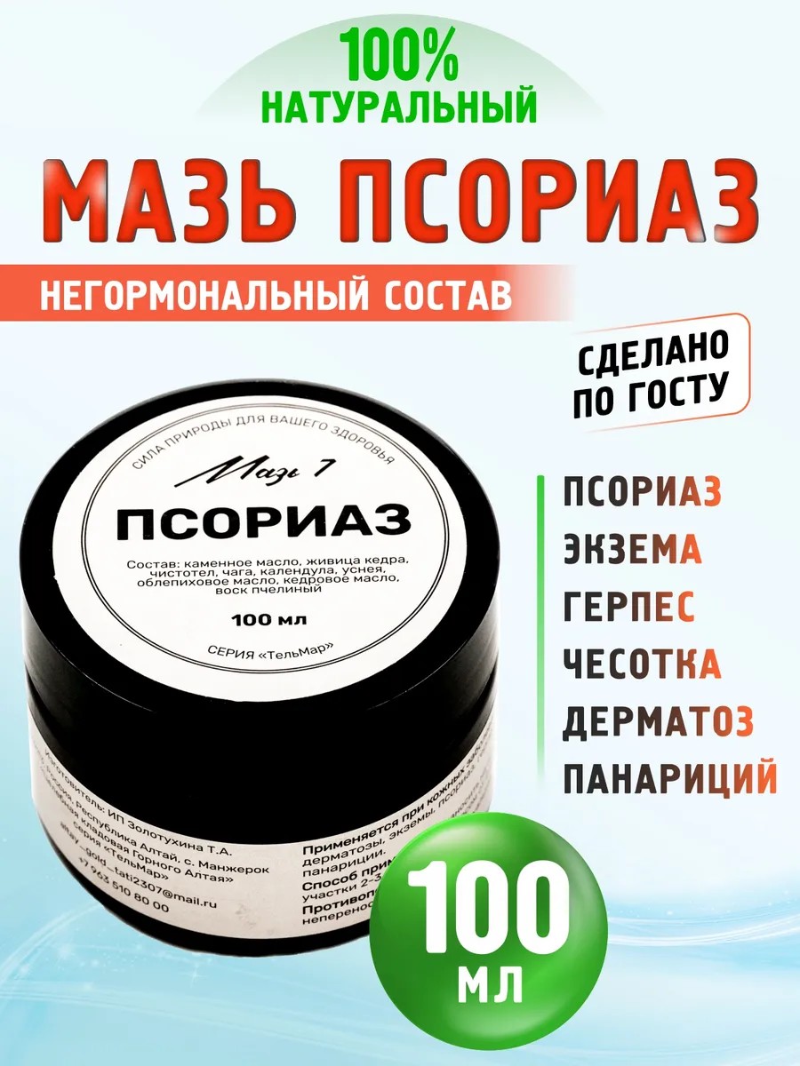 Psoriasis ointment is an effective natural remedy with an all-natural composition. The cream is hormone- and antibiotic-free, making it safe to use. This psoriasis cream effectively treats conditions such as atopic dermatitis, eczema, dermatoses, psoriasis, dermatitis, demodicosis, felon, and others. It helps reduce itching, relieve inflammation, reduce flaking, and improve circulation. It activates metabolic processes, promotes tissue healing and restoration, and effectively removes psoriatic plaques and relieves inflammation. The cream's main ingredients are derived from herbs from the Altai and Siberian regions. We guarantee the authenticity of the product.