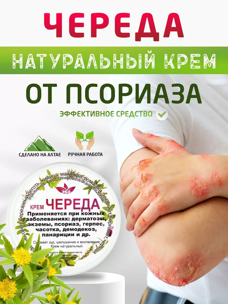 Мазь от псориаза Череда - это природное средство с полностью натуральным составом. Крем не содержит гормонов и антибиотиков, что делает его безопасным для использования. Крем для лечения псориаза отлично справляется с такими заболеваниями, как атопические дерматиты, экземы, дерматозы, герпес, псориаз, часотка, демодекоз, панариции и другие, способствует снижению зуда, снятию воспаления, уменьшению шелушения и улучшению кровообращения, активизирует обменные процессы, способствует заживлению и восстановлению тканей, также эффективно удаляет псориатические бляшки и снимает воспаление, Основные ингредиенты крема получены из трав алтайского и сибирского регионов, мы гарантируем оригинальность продукта.