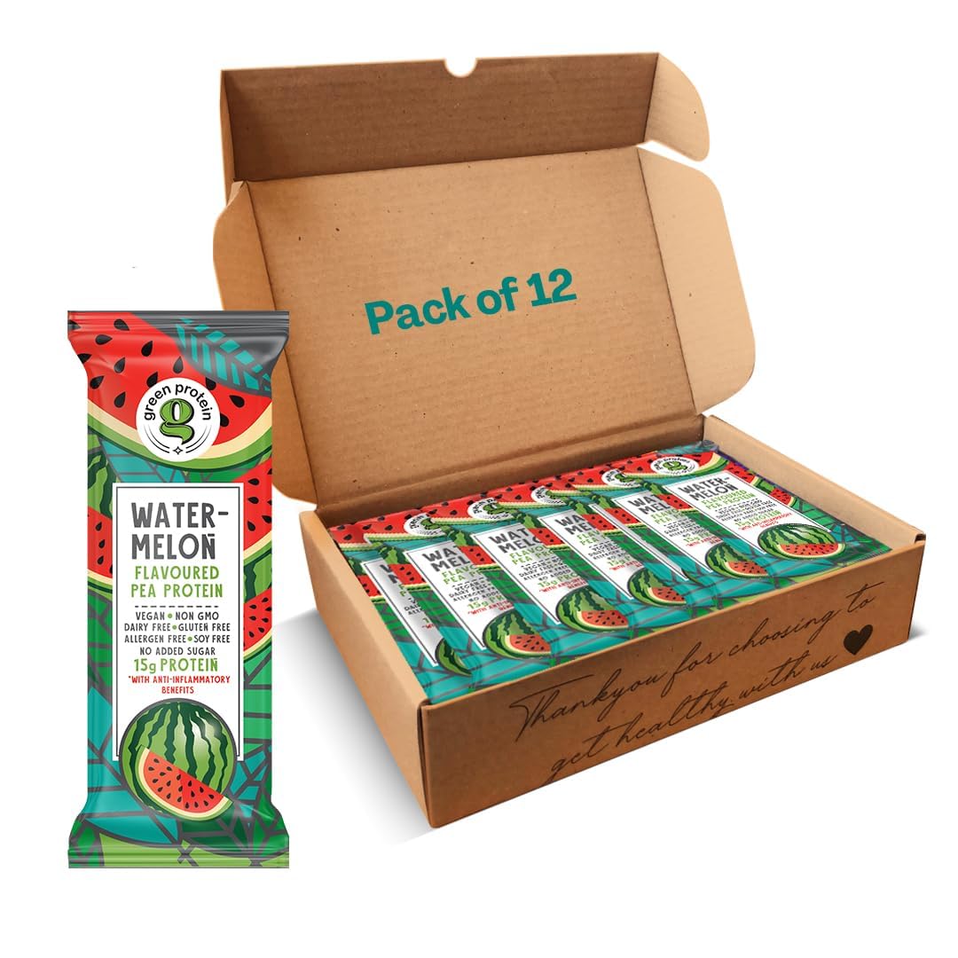 GREEN. PROTEIN Vegan Plant Pea Protein Isolate Powder, 15gm Protein Per Serving, No Added Sugar, 100 Vegan, Soy, Dairy, Gluten Allergen Free, Shark Tank, Watermelon Flavor, Pack Of 12, 23 gm eachThe sharks know quality when they taste it - Green Protein. With Green Protein you no longer have to choose between good health and great taste. Our Berry Blast flavour comes fortified with antioxidants that delay aging and help in faster recovery. Mixes easily in water with a spoon. No need for messy shakers to mix your protein drinks!. This product is 100 vegan, dairy free, gluten free, allergen free, soy free with no added sugar. It is highly bio-available and suitable for all. Contains 15g of high-quality pea protein sourced from Canadian yellow peas. It also contains 5.8g of Dietary fibre which aids digestion and helps in effective weight management.