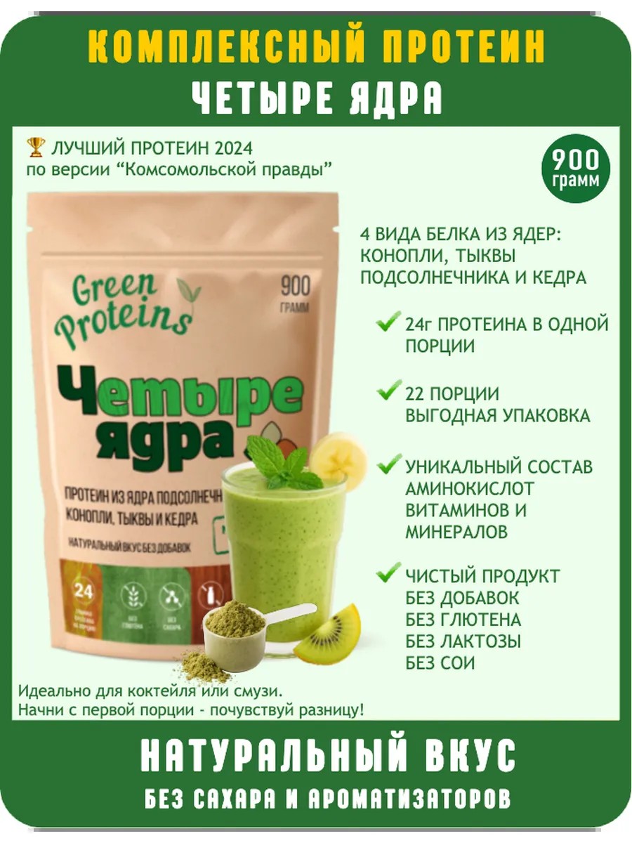 "Четыре ядра" – это уникальное сочетание четырех мощных растительных протеинов: протеина из ядра конопли, тыквы, подсолнечника и кедра.