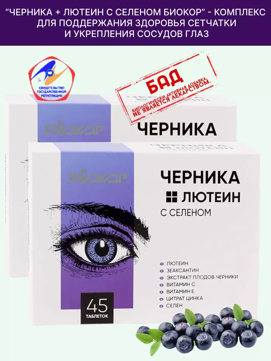 | Комплектация | Черника + Лютеин с селеном Биокор 45 табл, 2 уп |