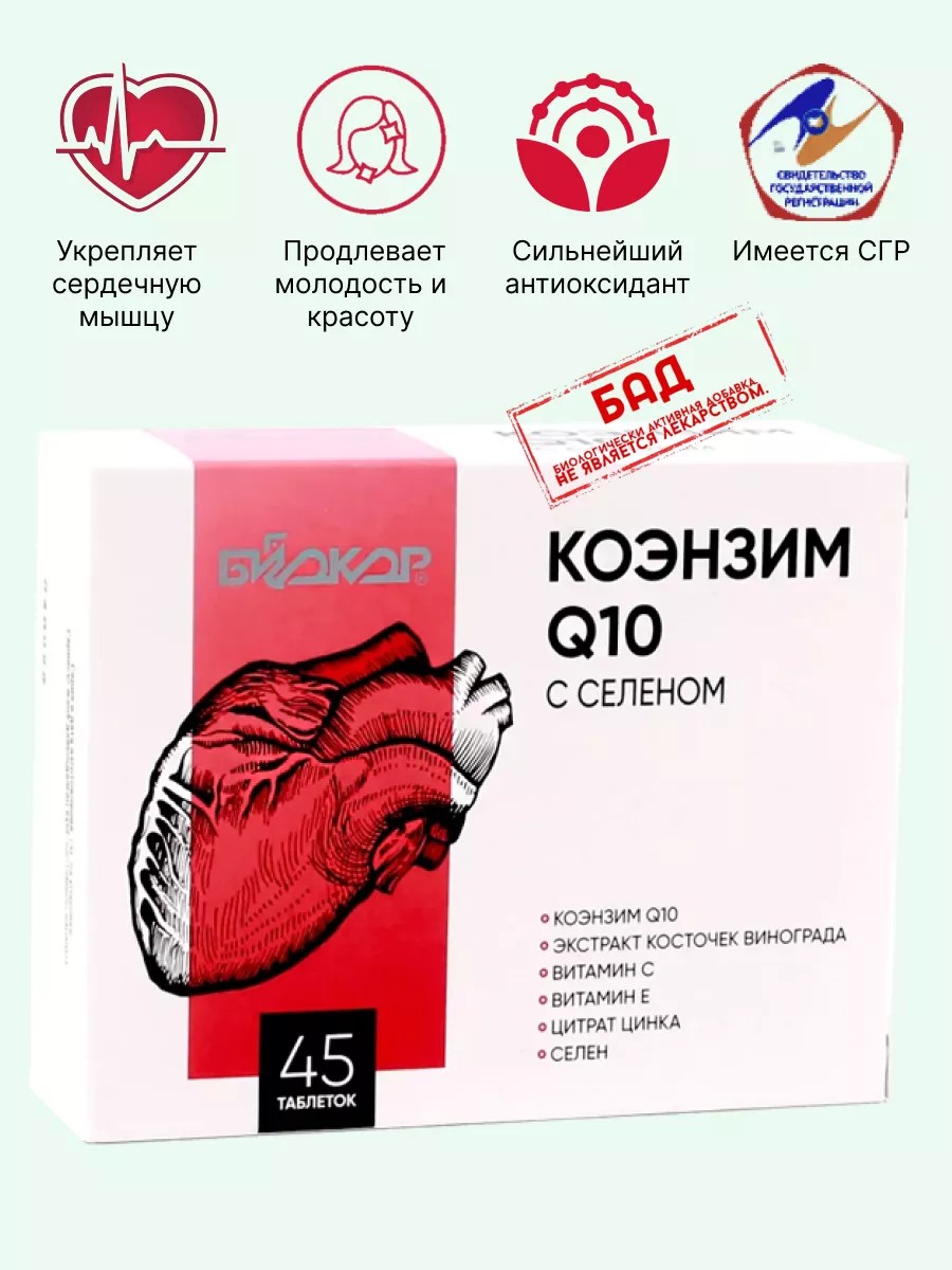 Coenzyme Q10 with selenium "Biocor" is a biologically active food supplement, a complex for supporting the function of the heart, muscles, and brain. Throughout a person's life, the heart contracts and relaxes slightly more often than once per second, providing the blood flow on which every other organ in the body depends. Such titanic efforts require a constant supply of energy.