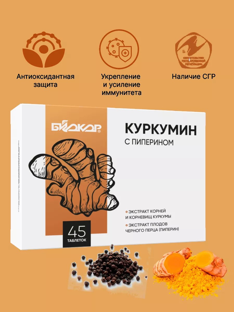| Комплектация | Куркумин с пиперином Биокор 45 табл, 1 уп |
