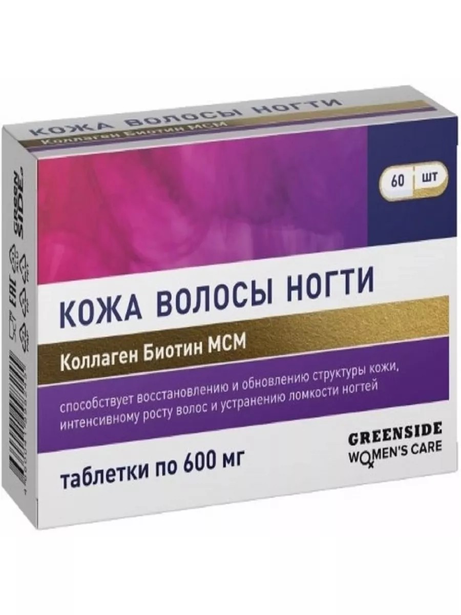 | Торговое наименование | Биологически активная добавка к пище «Кожа волосы ногти Коллаген Биотин МСМ». Форма выпуска: таблетки массой 600 мг, 1200 мг. |