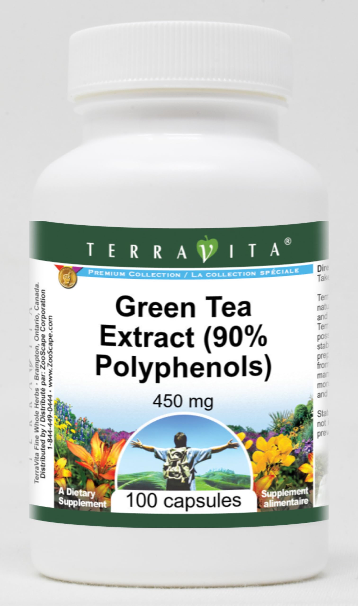 Green Tea Extract (90 Polyphenols) - 450 mg (100 capsules, ZIN: 514371) Packaged in the United States in a GMP certified facility (Good Manufacturing Practice). No fillers. Manufacturer: TerraVita Size: 100 capsules Easy-to-swallow Capsules in a sealed bottle. Ingredients: Gelatin, Water, Green Tea - 450 mg (Standardized Extract (90 Polyphenols))