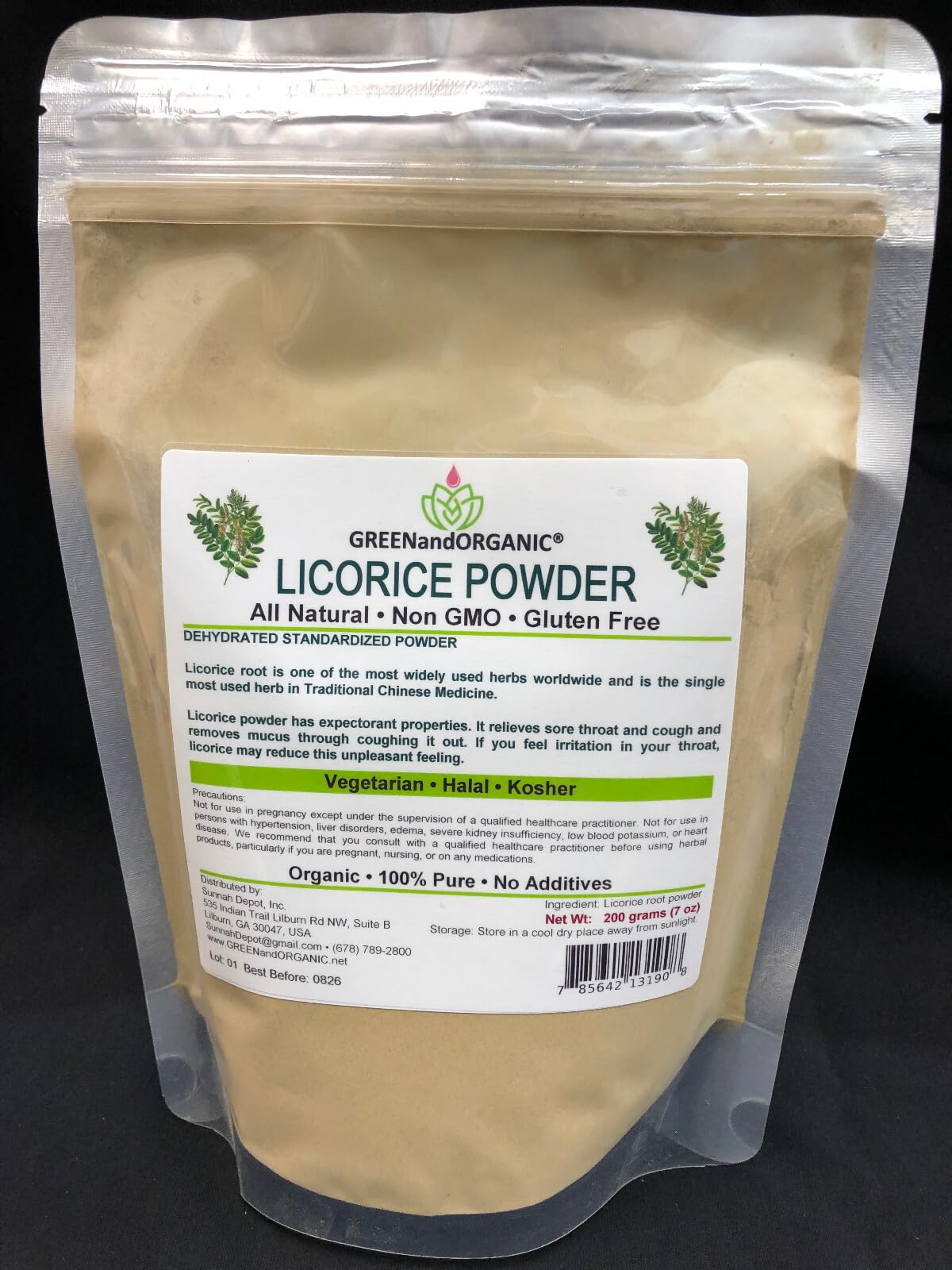 Organic Licorice Root Powder 100 Premium Size: 7 oz (200 grams) Licorice, also known as European licorice and common licorice, is an herb and spice produced from the underground rhizome of a plant in the legume family. The herb's genus name comes from the Greek words glykys and rhiza, which respectively mean "sweet" and "root." The combination also inspired the name for the primary constituent of licorice—glycyrrhizin. The sweet flavor of licorice root has been enjoyed for centuries throughout Europe and the Mediterranean region, starting with the ancient Romans and Egyptians. It is a versatile ingredient perfect for flavoring foods and beverages, also used as revitalizing herbal tonic INGREDIENTS 100 Pure Fresh Licorice roots (ground)