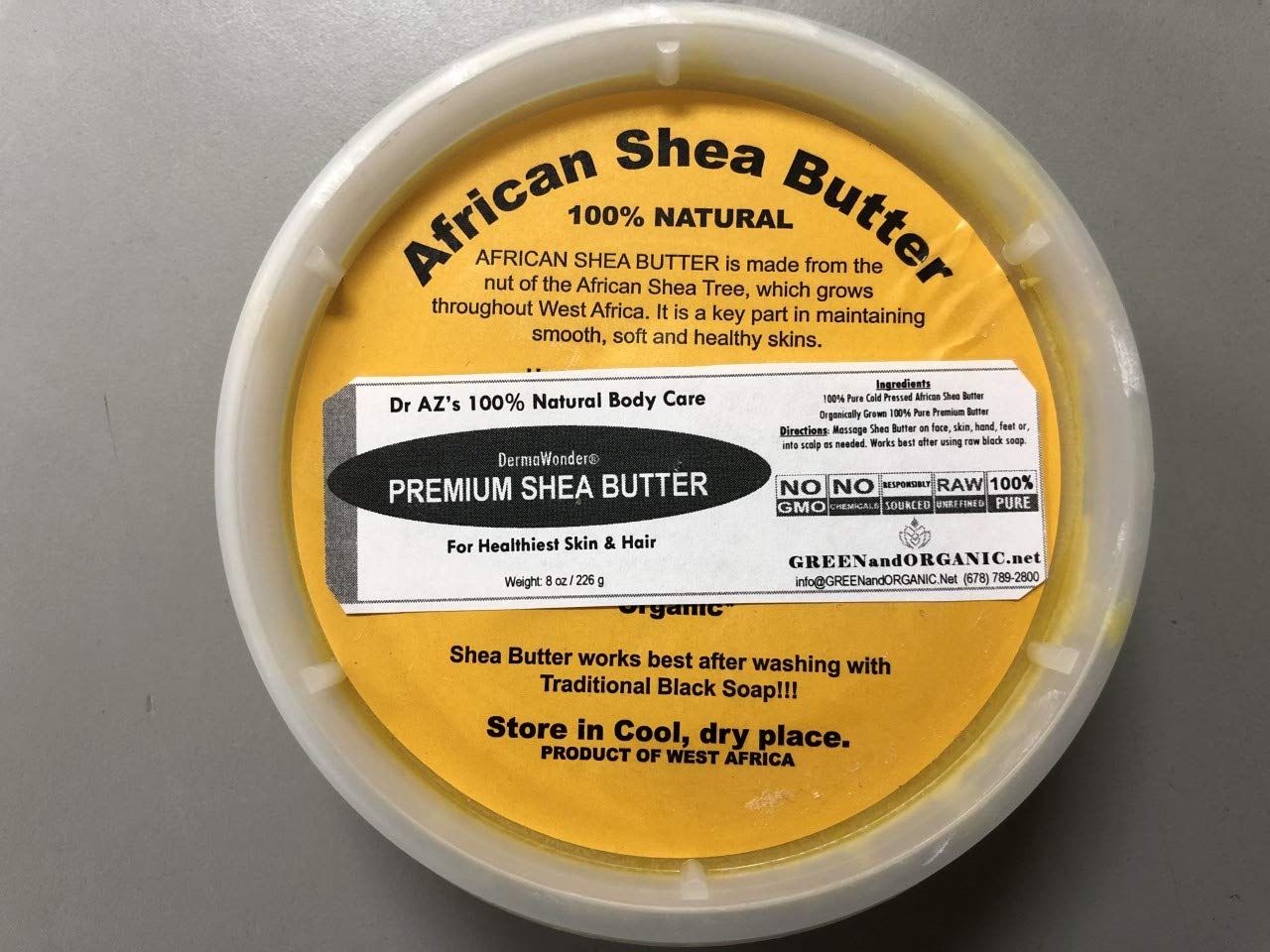 8oz Tub Jar RAW GRADE A Unrefined Virgin Organic African Shea Butter NATURAL White Ivory RAW SHEA BUTTER ,GUARANTEED 100 PURE COLOR: White Beige Ivory Greyish Greenish (we NEVER add anything to maintain a consistent color or smell of the butter. That's why color or smell may vary From batch to batch) 100 GUARANTEED Natural Looks may vary OUR Extra-Ordinary Shea Butter Obtained from the Shea Butter processors in the villages of Ghana through a cooperative society of the villagers. Produced in the nature from 100 organically grown trees. Fair Trade 100 Pure. No additives. No other ingredients Virgin Grade A Highest Quality INGREDIENTS : 100 PURE Shea Butter. Nothing else!! IMPORTANT NOTES This is butter in it's most NATURAL form. Not Filtered. Comes in BPA-FREE Deli Container inside Box. We pack UNFILTERED Shea butter directly from their NATURAL GOURD they come in. Please do not expect filtered or artificially processed butter. Due to temperature, upon receipt of shipment, you might find the Shea butter hard or soft or somewhat melted. This is absolutely NATURAL! At times, Shea Butter may come grainy or gritty due to NATURAL process of crystallization of fat in raw Shea Butter. This is normal. Just warm up gently and it will be smooth to use. This is a RAW product. We NEVER add anything to maintain a consistent color or smell of the butter. That's why color, texture or smell may vary from batch to batch. If you are sensitive about these things, PLEASE buy REFINED Shea Butter NOT this one.