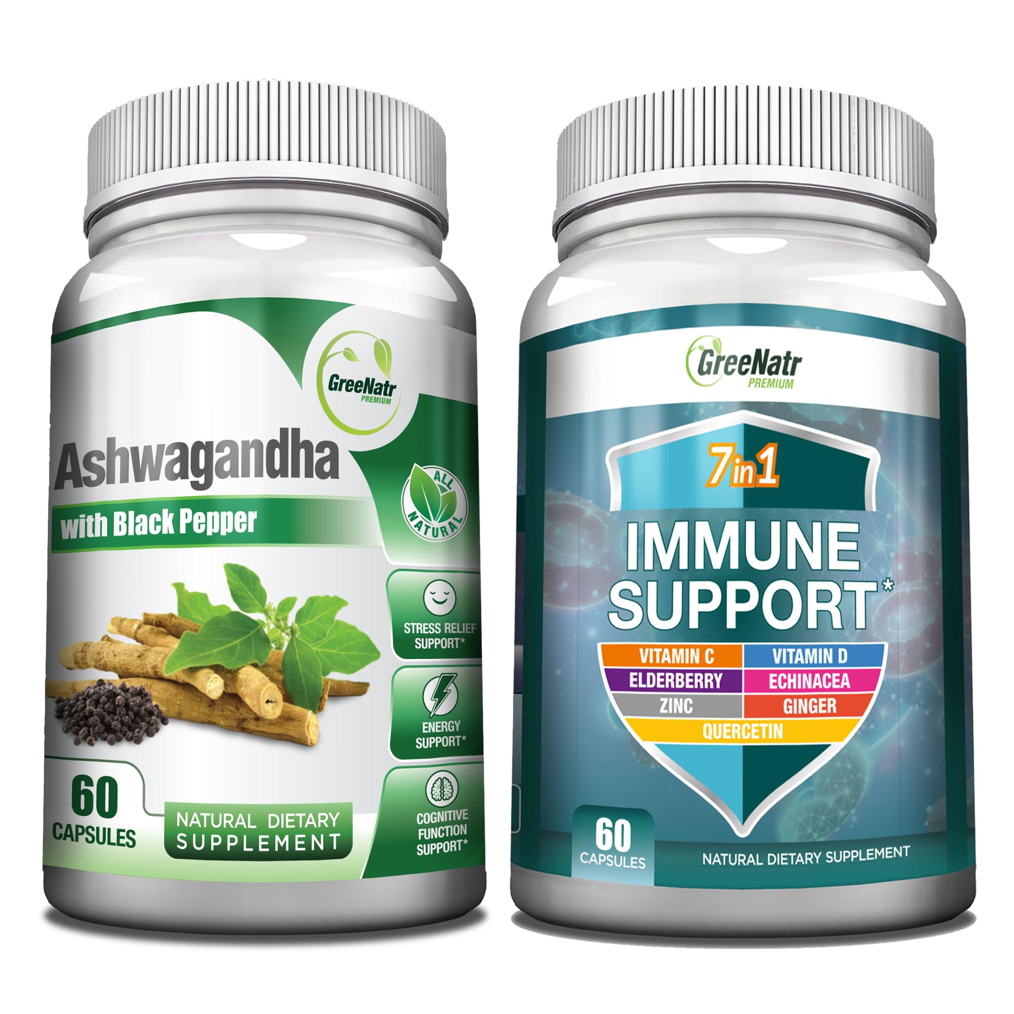 GreeNatr 7-in-1 Immune Support Supplement with Vitamin C Vitamin D3 Zinc 50mg Quercetin Combined with Organic Ashwagandha Capsules Featuring Black Pepper for Enhanced Absorption