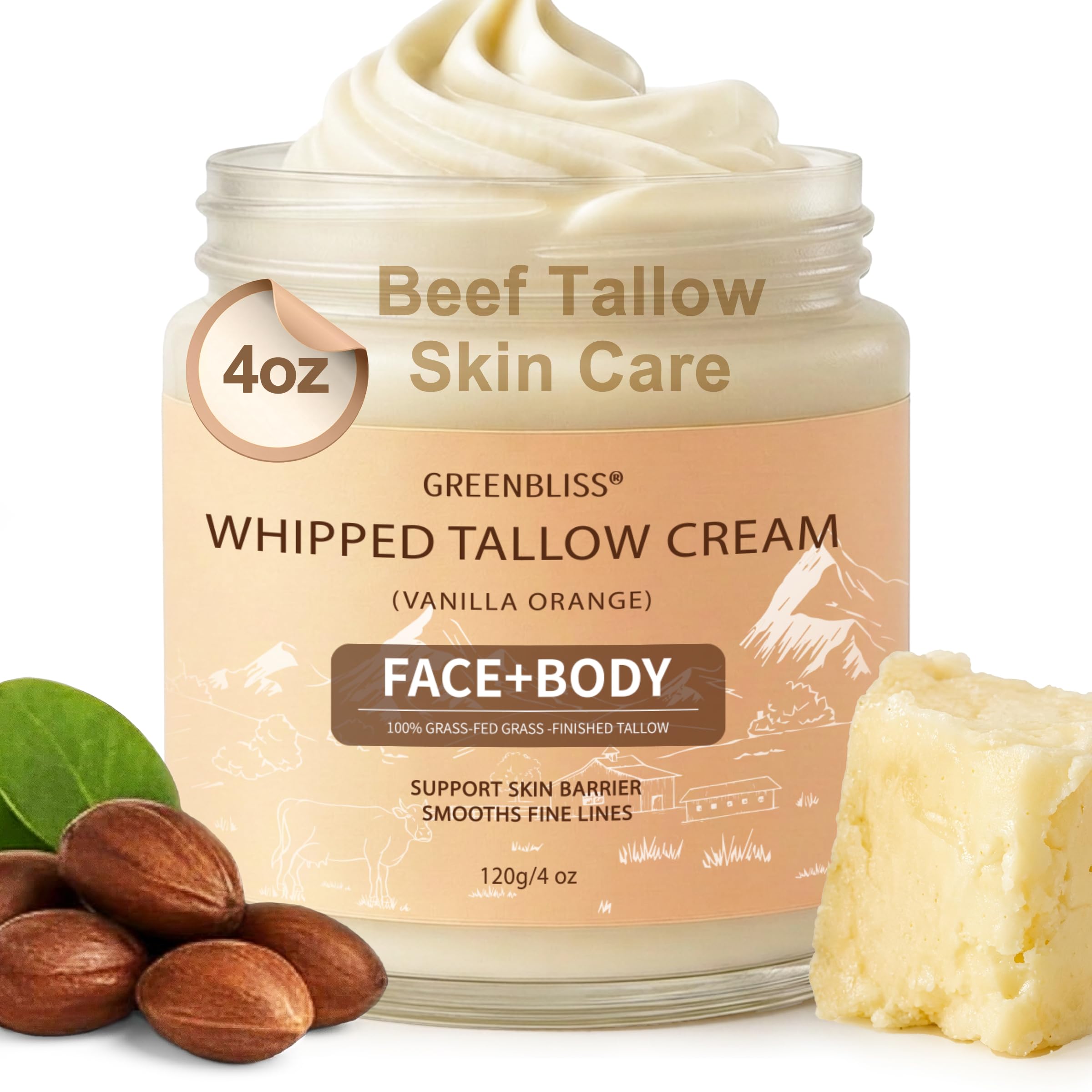 GreenBliss Beef Tallow for Skin Care 100% Organic Grass Fed tallow and honey balm - Face + Body, Whipped Moisturizer for Sensitive Skin, Natural Deep Hydration, Sensitive Skin Safe, 120G/4 FL. oz.