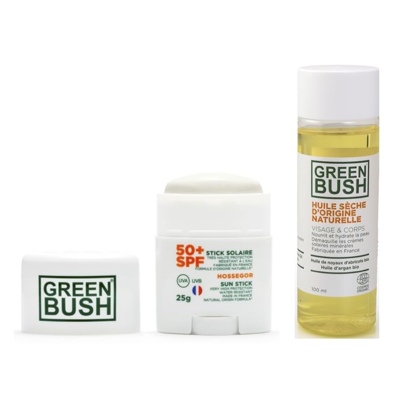 Our sun sticks are composed entirely of natural minerals which are organic shea butter, organic macadamia oil and organic aloe vera. They have been designed for the practice of nautical activities and have great water resistance. Our oil deeply hydrates and nourishes your skin. It also allows you to remove makeup from sun care products based on mineral filters. Characteristics of the Greenbush Stick SPF 50: Protection index: 50 High UVA and UVB protection Helps prevent cellular damage and skin aging Made in France Does not degrade coral Moisturizes and nourishes the skin Mineral filter (non-chemical) High hypoallergenic tolerance Paraben-free Fragrance-free Oxybenzone-free Octinoxate-tested Dermatologically tested Easy to spread Extremely resistant to water and perspiration Weight: 25 g Characteristics of the dry oil: Made in France Formula of natural origin Hydrates and Nourishes the skin Removes makeup from mineral sun creams 100 ml bottle Transparent color COSMOS ORGANIC certified by Ecocert Greenlife according to the COSMOS standard. SAFETY WARNING External useOrganic hydration protection. Nos sticks solaires sont composés entièrement avec des minéraux naturels qui sont le beurre de karité bio, l'huile de macadamia bio et l'aloé vera bio. Ils ont été pensés pour la pratique des activités nautiques et ont une grande résistance à l'eau. Notre huile hydrate, nourrit votre peau en profondeur. Elle permet aussi de démaquiller les soins solaires à base de filtres minéraux. Caractéristiques du Greenbush Stick SPF 50 : Indice de protection : 50 Haute protection UVA et UVB Aide à prévenir les dommages cellulaires et le vieillissement cutané Fabriqué en France Ne dégrade pas le corail Hydrate et nourrit la peau Filtre minéraux (non chimiques) Haute tolérance hypoallergénique Sans paraben Sans parfum Sans oxybenzone Sans octinoxate Testé sous contrôle dermatologique Facile à étaler Extrêmement résistant à l'eau et à la transpiration Poids : 25 g Caractéristiques de l'huile sèche: Fabriquée en France Formule d'origine naturelle Hydrate et Nourrit la peau Démaquille les crèmes solaires minérales Flacon de 100 ml Couleur transparente Certifié COSMOS ORGANIC par Ecocert Greenlife selon le référentiel COSMOS. AVERTISSEMENT DE SÛRETÉ Usage externeProtection hydratation Bio.