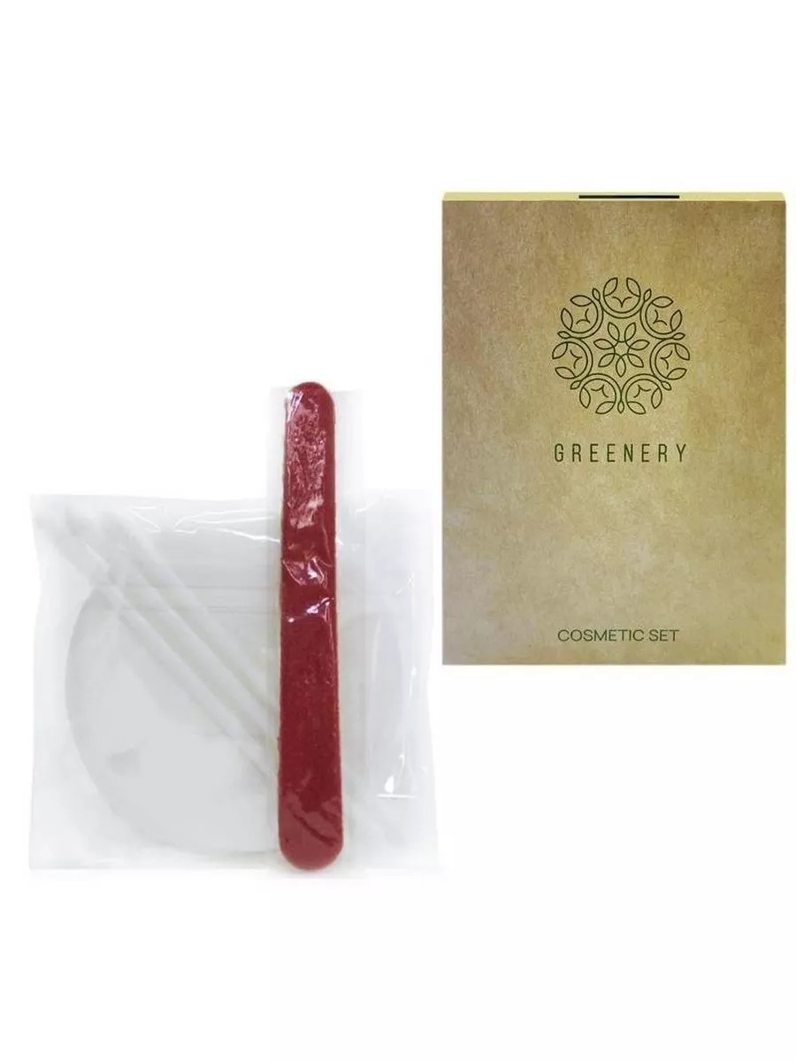 GREENERY Greenery cosmetic set, cardboard packaging, 300 pieces per package. Cosmetic set - attention and care for your guests. This set includes: - cotton pads - 3 pieces (diameter 55 mm); - cotton swabs - 3 pieces (length 75 mm, with cotton material twisted at both ends); - nail file 80 mm long. Abrasiveness - 240 grit. Sticks and pads are packed in a single polyethylene package, the nail file is in a separate polyethylene package. All items are packed in one cardboard box. Sets are supplied in packages of 300 pieces.