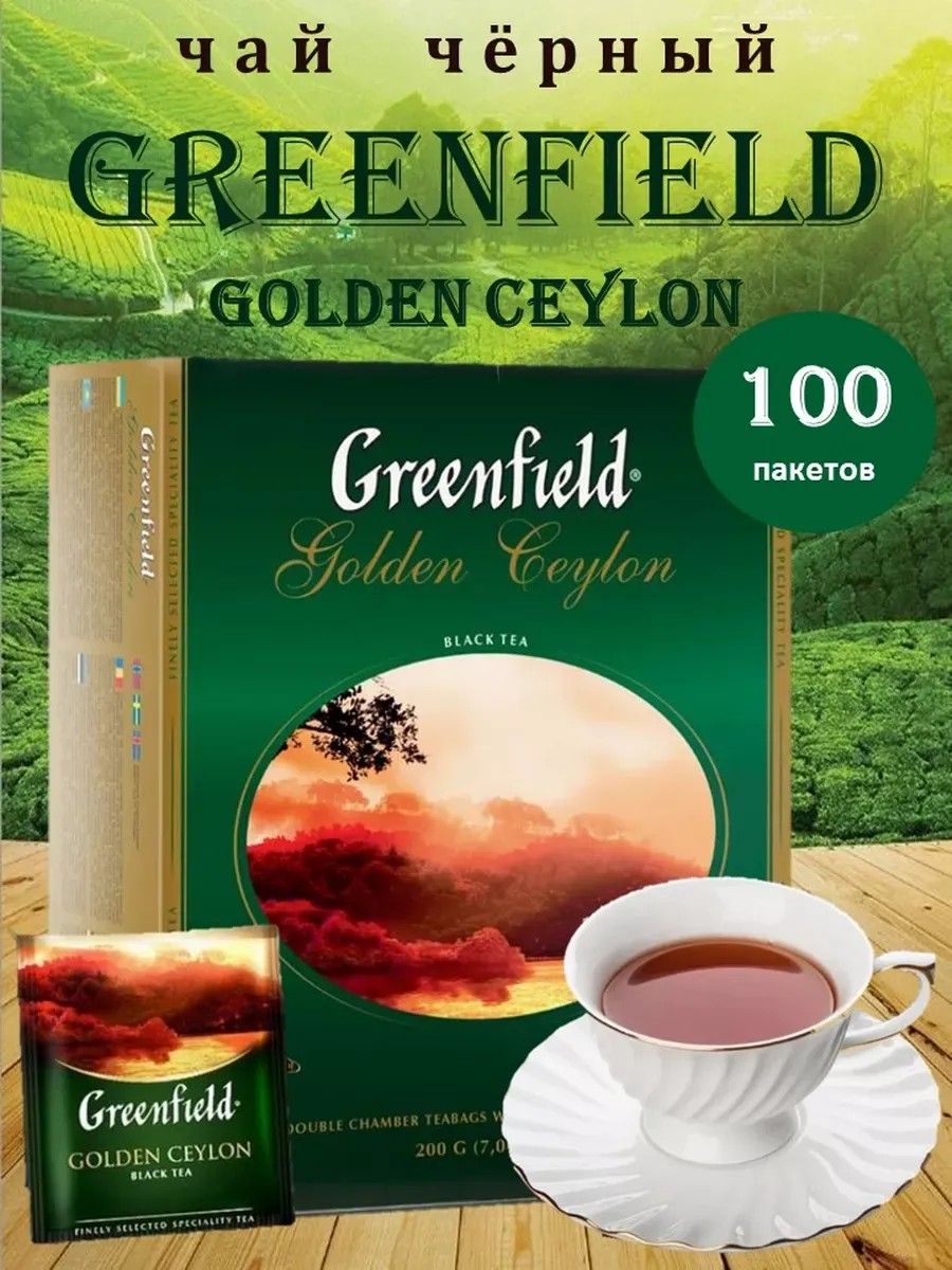 Черный цейлонский, байховый чай GREENFIELD Golden Ceylon 100 пакетиков. Чай черный Гринфилд Голден Цейлон без добавок. Исключительную свежесть чая гарантирует индивидуальная упаковка для каждого пакетика специальной фольгированной упаковке. В коробке 100 пакетов по 2гр.