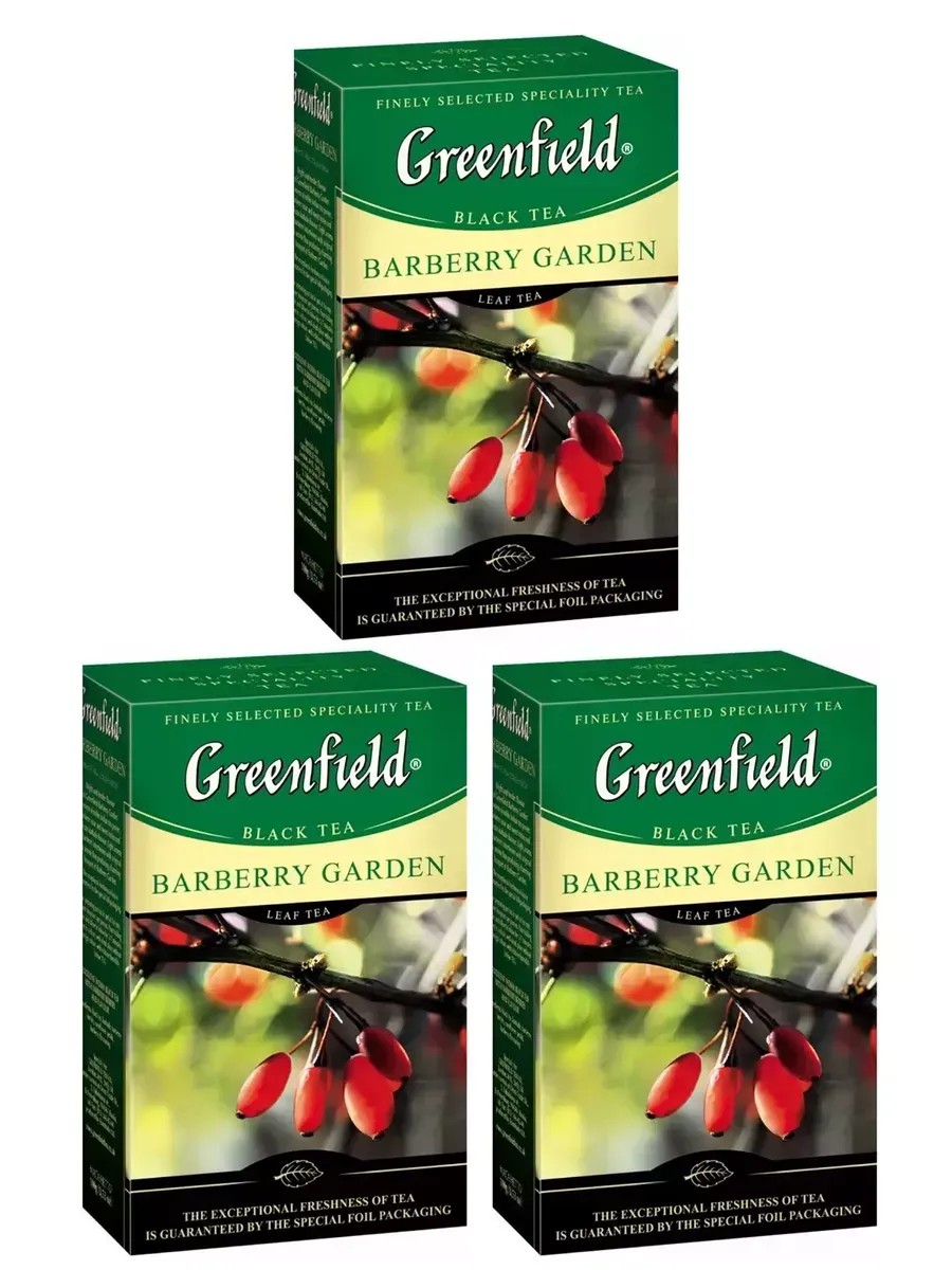 Greenfield Чай черный Barberry Garden, 100 г, 3 шт. Откройте для себя насыщенный и ароматный чай Greenfield Barberry Garden (Гринфилд Барбери Гарден), который производится в Индии. Этот чай обладает уникальным вкусом и ароматом, благодаря сочетанию индийского чая с ягодами барбариса и гибискусом. В ярком вкусе Greenfield Barberry Garden душистый аромат барбариса переплетается с естественным чайным ароматом. Барбарис вносит в композицию характерные сладкие ноты, а гибискус придает легкую свежую кислинку. Чай Greenfield Barberry Garden упакован в картонную коробку весом 100 грамм. Храните его в сухом, хорошо проветриваемом помещении без посторонних запахов с относительной влажностью воздуха не выше 70%. Greenfield Barberry Garden не содержит искусственных ароматизаторов и ГМО, что делает его безопасным и натуральным выбором для вашего здоровья.