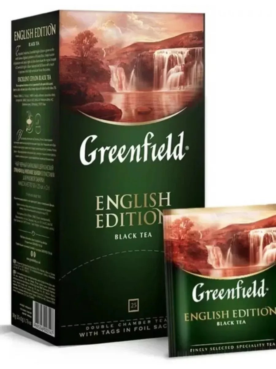 Greenfield English Edition, чай черный, в комплекте 1 упаковка, в упаковке 25 пакетиков по 2г. Крупнолистовой цейлонский чай. Отличается идеально сбалансированным мягким вкусом с тонкими пряными оттенками и ярким свежим ароматом, присущим элитным цейлонским чаям.