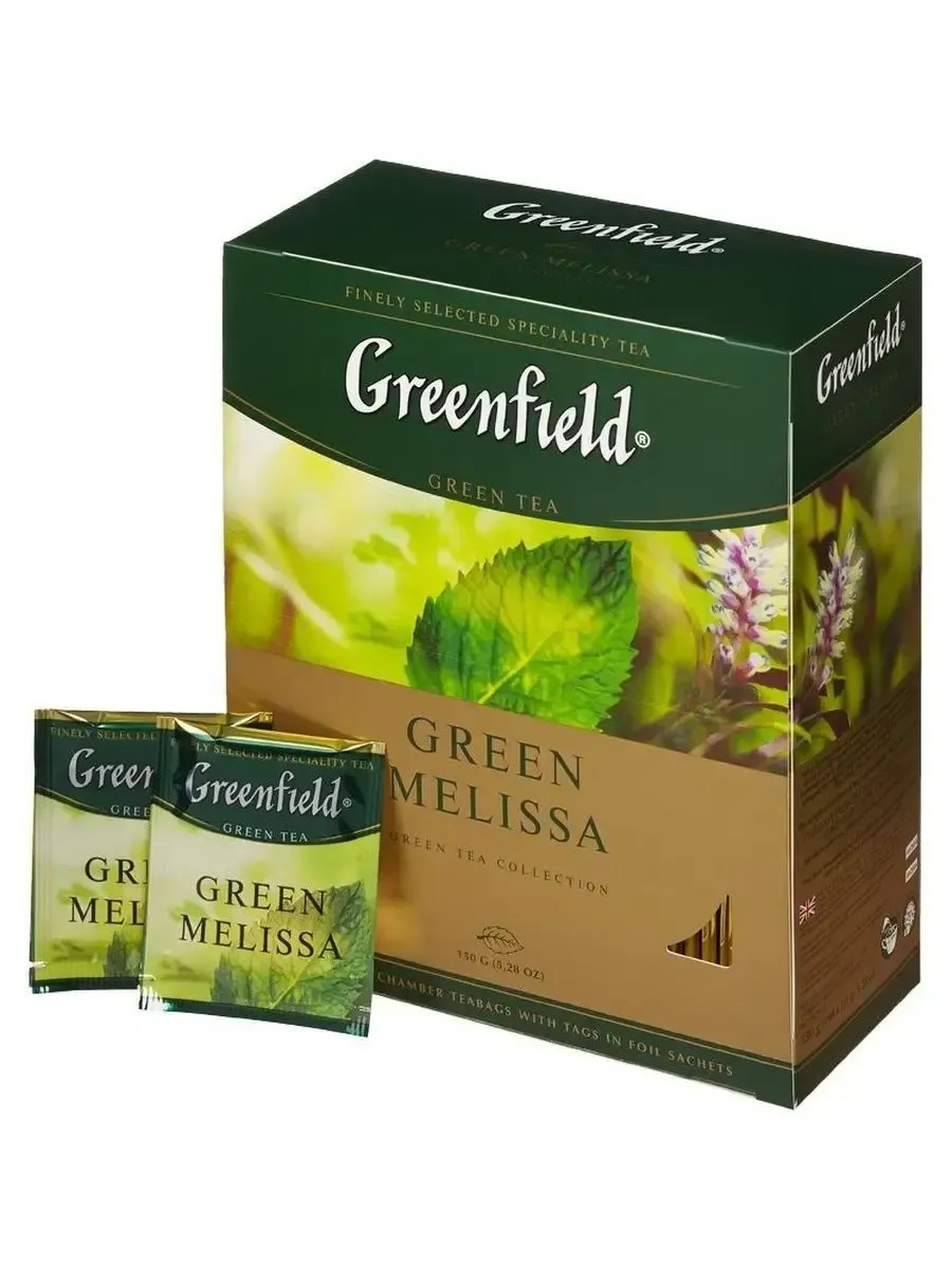 Greenfield Зеленый чай с мелиссой Green Melissa, 100 пакетиков х 1,5 г. Greenfield Green Melissa — восхитительный и манящий зелёный чай с душистыми травами. Естественный лимонный аромат мелиссы в сочетании с терпким чаем и лёгким оттенком мяты создаёт совершенно уникальный вкус. Green Melissa прекрасно освежает в жаркий день. Зеленый чай Greenfield Green Melissa изготовлен из китайского зеленого чая и душистых трав — мяты и мелиссы. Обладает мягким шелковистым вкусом, отличающемся терпкостью с сочетанием пряной мяты и лимонного аромата мелиссы. Заваренный чай имеет чистый зеленоватый тон. Превосходно освежает, успокаивает и помогает снять эмоциональное напряжение. Зеленый чай Greenfield Green Melissa расфасован в 100 бумажных пакетиков, каждый из которых помещен в упаковку из фольги. Фольга идеально сохраняет свойства чая, препятствует отсыреванию и попаданию посторонних запахов, защищает продукт от света. Упаковка из 100 пакетиков зеленого чая Greenfield Green Melissa идеально подходит для чаепития в офисе.