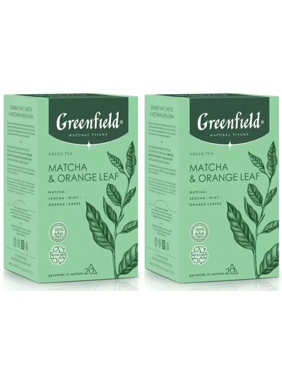 Greenfield Чай в пирамидках зеленый Matcha Orange Leaf 2 уп по 20 шт. Оригинальный сладковато-пряный букет рождается из виртуозного переплетения травянистых нот чая матча и чая сенча, тонкой сладости апельсиновых листьев и легкой волны аниса, наполняющей восхитительно долгое послевкусие.