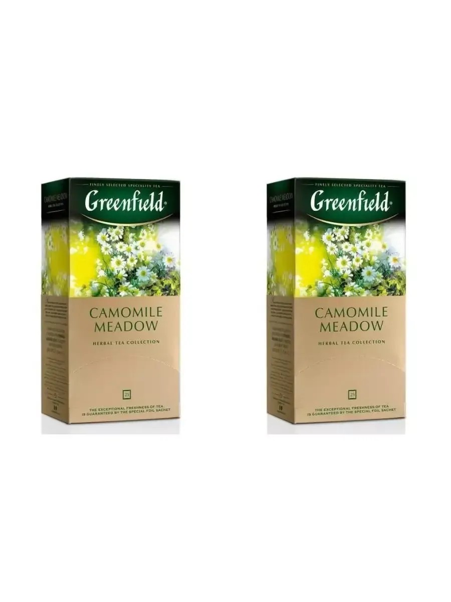 Greenfield, Чай травяной Camomile Meadow, 25 пакетиков. Мягкий цветочный вкус в букете ромашкового чая Camomile Meadow оживлен тонкими нотами душистой мелиссы. Неожиданный акцент – дерзкий и жизнерадостный аромат личи – создает ощущение пленительной свежести и чистоты. Не содержит кофеина. В комплекте 2 штуки.