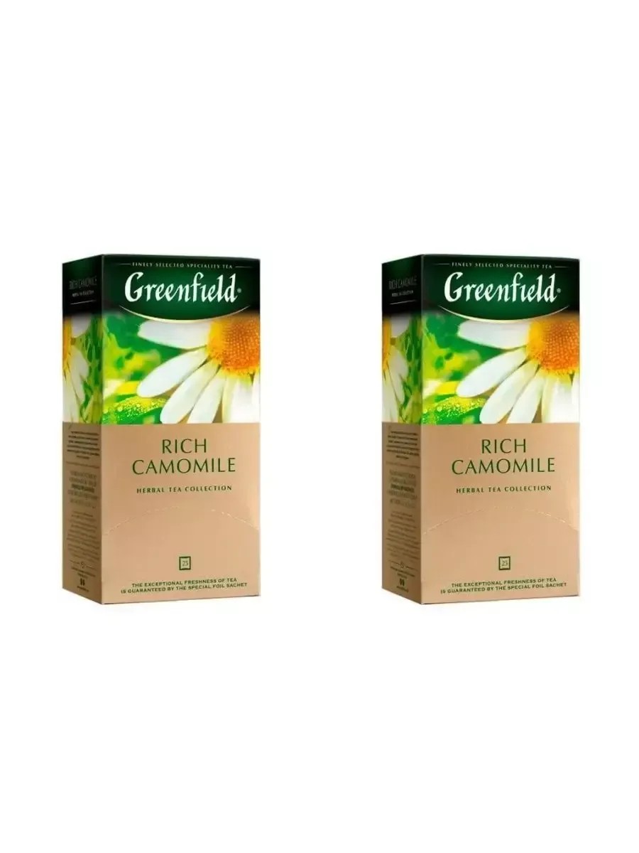 Greenfield, Чай травяной Rich Camomile, 25 пакетиков. Основу природного комплекса травяного чая Rich Camomile составляют нежные цветы ромашки. Сладковатый оттенок сушеных яблок дополняет естественный цветочный вкус, а корица вносит приятную остроту в мягкую гамму. Не содержит кофеина, помогает снять напряжение. В комплекте 2 штуки.