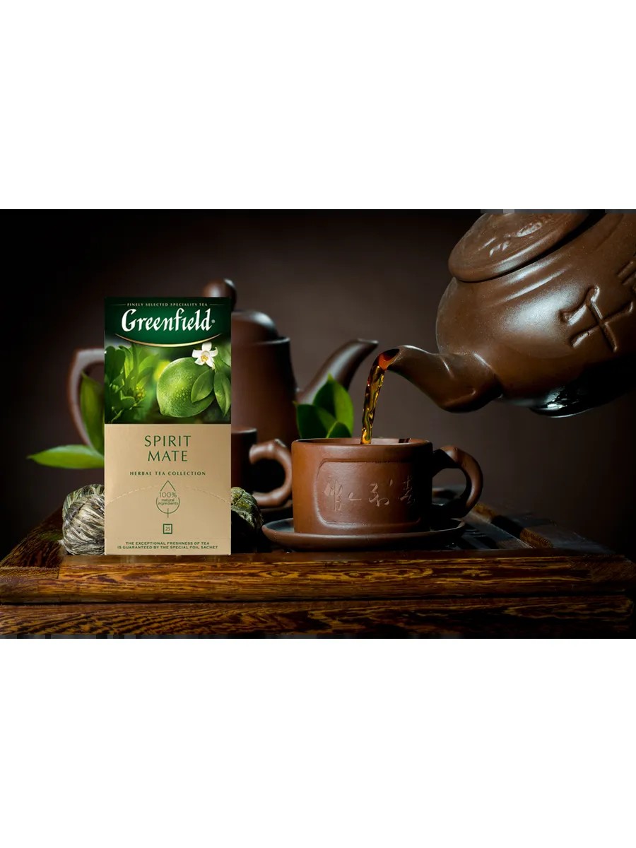 An ethnic drink made from the leaves of a Latin American evergreen shrub. The bold composition of Greenfield Spirit Mate combines the high energy and distinctive, rich flavor of this traditional Guarani Indian drink with the bitter, fresh aroma of juicy lime. It helps relieve fatigue, invigorates, and promotes concentration.