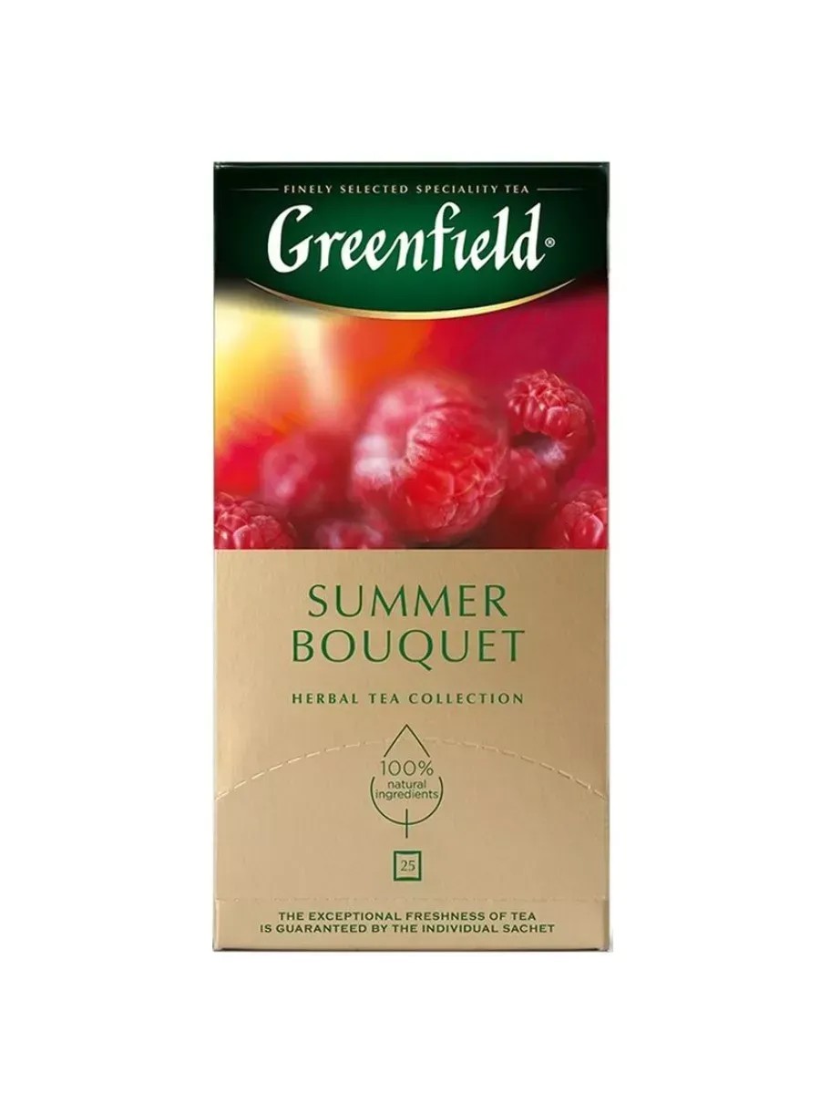 Чай ягодный фруктовый Greenfield Summer Bouquet 25 пакетиков (малина). Чай Greenfield Summer Bouquet представляет собой фруктово-ягодный напиток, включающий в состав кусочки малины, сушеное яблоко, плоды шиповника, гибискус. Продукт без кофеина содержит большое количество витаминов. Употреблять фруктовый чай можно как в горячем, так и в охлажденном виде. В первом случае он оказывает согревающее действие, во втором — освежающее. Продукт расфасован в пакетики из фольги, что способствует длительному сохранению вкусовых качеств. В картонной упаковке.