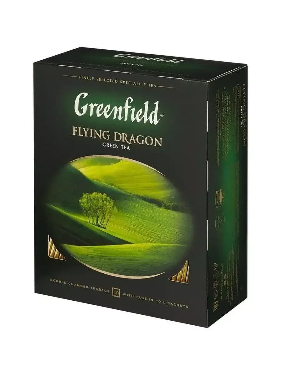 Greenfield Flying Dragon Green Tea, 100 bags/pack. Greenfield Flying Dragon green tea is made from green Chinese tea grown at an altitude of over 1,000 meters in the Hunan Province. At this altitude, tea leaves grow especially tender. The light floral aroma combined with the delicate taste has a refreshing effect, gives energy, and has a beneficial effect on productivity throughout the day. The tea infusion has a yellowish color. Greenfield Flying Dragon green tea is packaged in 100 paper bags, each of which is placed in foil packaging.