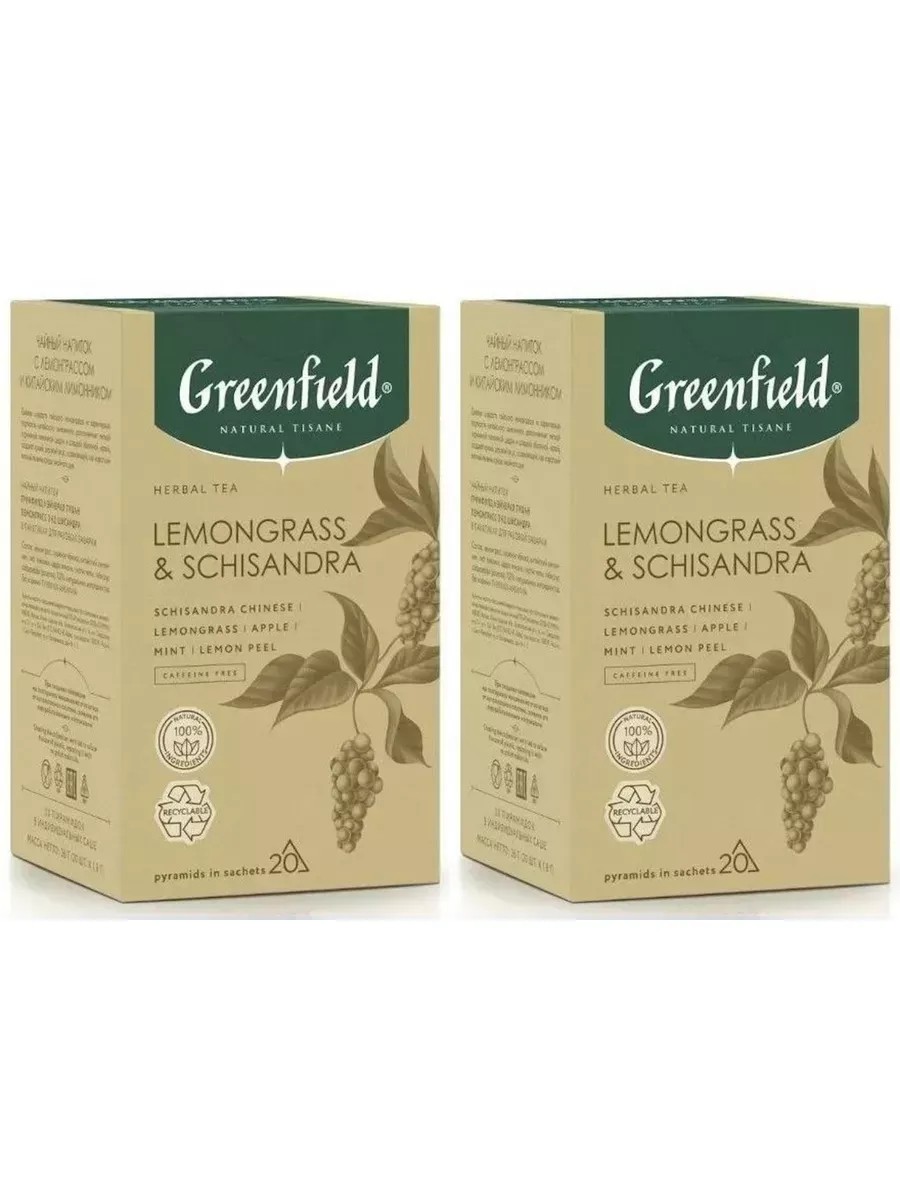 Greenfield Чай в пирамидках Natural Tisane Lemongrass & Schisandra 2 упаковки по 20шт. Чай на основе тайского лемонграсса с сочной кислинкой лимонника китайского (шисандры). Сладкий, освежающий. Это первая в мире комбинация таких ярких и самостоятельных ингредиентов в одном купаже. Тайский, богатый цитрусовыми эфирами лимонник, белый легкий кислинкой гибискус, сладкая балансирующая кислотность купажа китайская ежевика. Настоящая азиатская бомба мирового уровня!