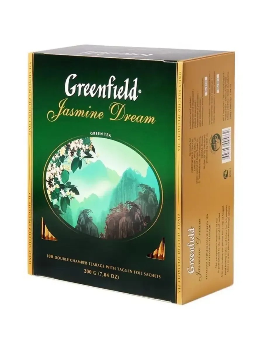 Greenfield Зеленый чай с жасмином Jasmine Drim, 100 пакетиков х 2 г. Jasmine Dream – зеленый жасминовый чай с плантаций китайской провинции Юньнань. Сочетает тонкий аромат жасмина и чистый вкус зеленого юньнаньского чая. В провинции Юньнань время цветения жасмина совпадает с первым сбором знаменитого юньнаньского чая. Сразу после сбора чайные листья режут на полоски, слегка завяливают в естественной тени деревьев, а затем помещают в бамбуковые корзины и подсушивают над открытым огнем. Горячие чайные листья смешивают с таким же количеством белого жасмина, который обязательно срывают вечером, когда цветы благоухают особенно сильно, и выдерживают некоторое время, чтобы чай успел вобрать всю полноту цветочного аромата. Чай пропитывается нежным цветочным ароматом, а затем лепестки вручную удаляют. Так традиционно в Китае готовят дорогие сорта жасминового чая – чем выше сорт чая, тем тщательнее выбирают лепестки жасмина. Эфирные масла, содержащиеся в цветах жасмина, усиливают тонизирующие свойства зеленого чая, поэтому Jasmine Dream обладает выраженным «пробуждающим» эффектом и считается идеальным утренним чаем.
