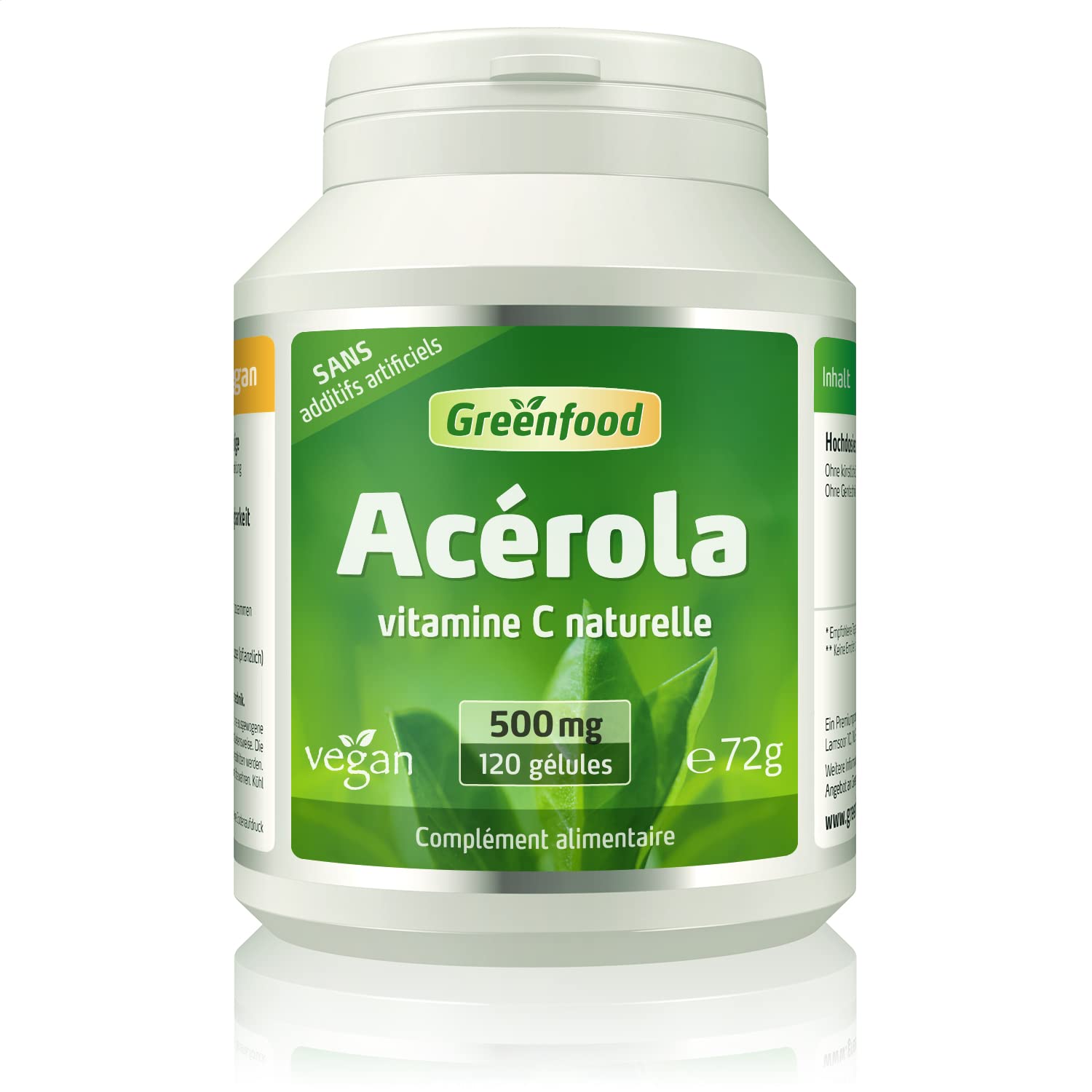 Greenfood Acérola, 500 mg, dose élevée, 120 gélules - une source idéale de Vitamine C naturelle- Sans additifs artificiels. Sans génie génétique.Vegan.