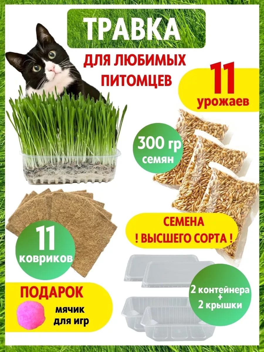 This grass for animals (cats, rabbits, hamsters, birds, guinea pigs, and parrots) contains highly viable oat, wheat, and barley seeds without any chemical additives. The set includes: 2 containers, 2 lids, 11 jute mats for germination, and 3 300g packets of seeds (oats, barley, and wheat), enough for 11 plantings. Germination instructions are included.