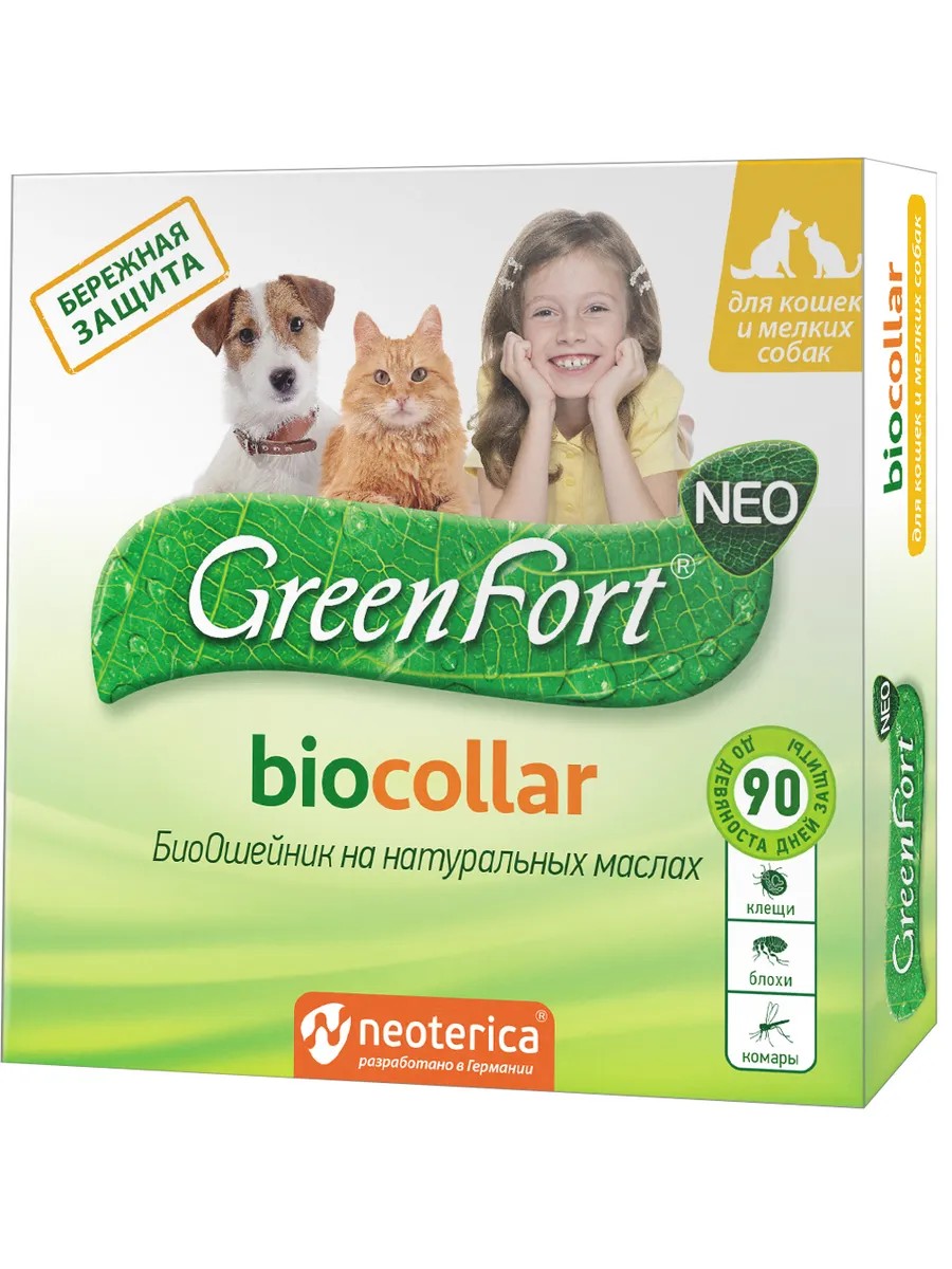 GreenFort NEO (Neoterica) биоошейник для кошек и собак малых пород, от паразитов, 40 см. GreenFort NEO (Neoterica) биоошейник для кошек и собак малых пород, от паразитов, 40 см. БиоОшейник GreenFort NEO для кошек и мелких собак, 40 см Иногда питомцам нельзя использовать химические препараты от паразитов. Противопоказания бывают разные: аллергические реакции, молодой возраст или беременность, болезни. А паразиты только и ждут удобного случая, чтобы атаковать наших собак и кошек. Не оставляйте своего питомца без защиты используйте эффективные и безопасные средства GreenFort NEO! GreenFort NEO это эффективные средства для бережной защиты животных от эктопаразитов ? Эфирные масла: Отпугивают паразитов (репеллентное действие) Снимают раздражение и зуд Ошейник GreenFort NЕО защищает 3 месяца от: ? Иксодовых клещей ? Блох, вшей, власоедов ? Комаров, мух и слепней Используйте ошейник GreenFort NЕО для бережной защиты: ? Собак и кошек ? Котят и щенков с 4 недель ? Беременных и кормящих ? Больных и выздоравливающих ? Склонных к аллергии Длина ошейника: 40 см, цвет: зеленый. Способ применения: Разверните ошейник и свободно закрепите на шее животного. Ошейник следует носить постоянно и сменить на новый по истечении срока действия.
