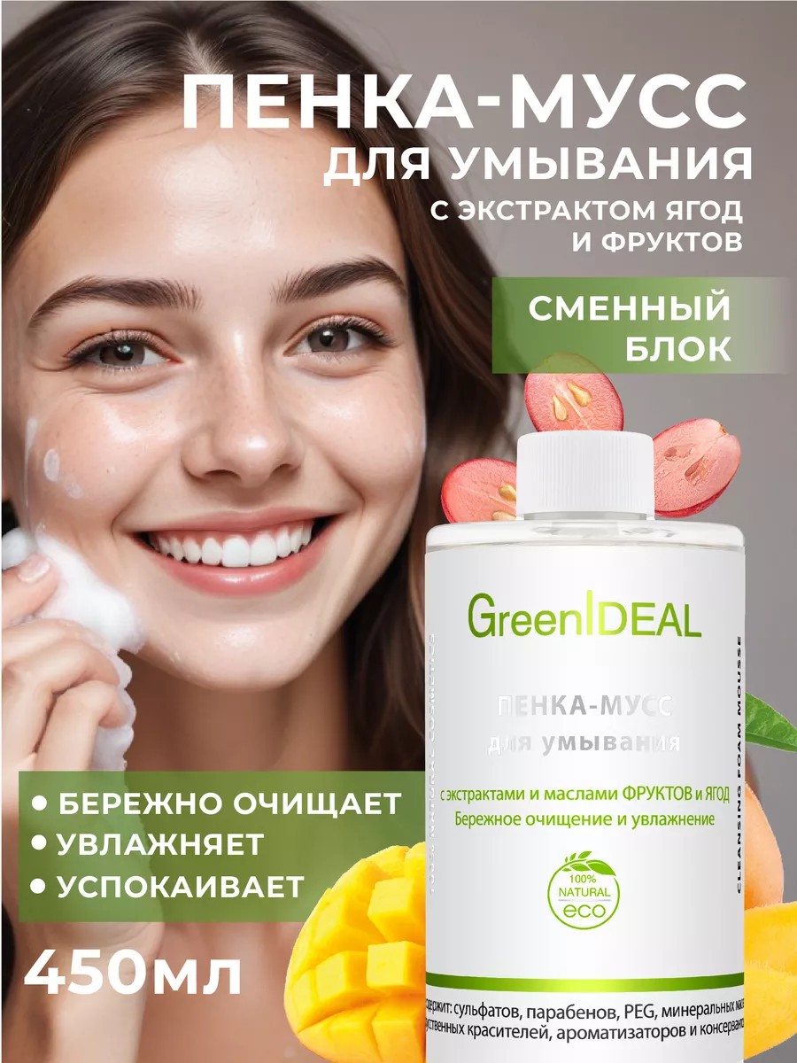 Хотите найти пенку для умывания, которая подходит для чувствительной или раздраженной кожи? Попробуйте сменный блок на мусс для умывания GreenIDEAL. Наш продукт содержит экстракты и масла фруктов и ягод, которые обеспечивают коже не только чистоту, но и дополнительное питание и увлажнение. Средство для умывания легко смывается и не оставляет тяжелой пленки, не содержит сульфатов и парабенов, что делает его идеальным для женщин с чувствительной или раздраженной кожей. Наша пенка для умывания обладает уникальным воздействием на кожу. Она легко очищает поры и поверхность лица, повышает упругость кожи и стимулирует микроциркуляцию. Он также может использоваться как отличное средство для снятия макияжа и подходит для жирной кожи. Натуральный состав прекрасно проникает в более глубокие слои кожи, снимает раздражения и борется с черными точками, при этом не нарушая липидно-щелочной баланс. Он оказывает антиоксидантное и успокаивающее воздействие, подходит для всех типов и возрастов кожи. Состав нормализует секрецию и подготавливает кожу к увлажнению. Косметика GreenIDEAL не имеет сильно-выраженного запаха и красящих компонентов, что делает её идеальной для ухода за чувствительным эпидермисом склонным к раздражению. Наша очищающая пенка для лица работает в порах, обновляет эпидермис, снимает загрязнения и излишек кожного жира. Она бережно отшелушивает, дарит коже сияние и ощущение приятной гладкости, помогает в борьбе с покраснением успокаивает поверхность кожи и уменьшает покраснение, помогает в борьбе от угрей. Отдавайте предпочтение косметике GreenIDEAL. Наши формулы пенок базируются на активных ингредиентах, их можно использовать как средство от прыщей - они помогают в борьбе против акне. Наш продукт отлично подходит как ежедневный уход за лицом для подростков. Объём сменного блока умывалки чуть меньше 500мл
