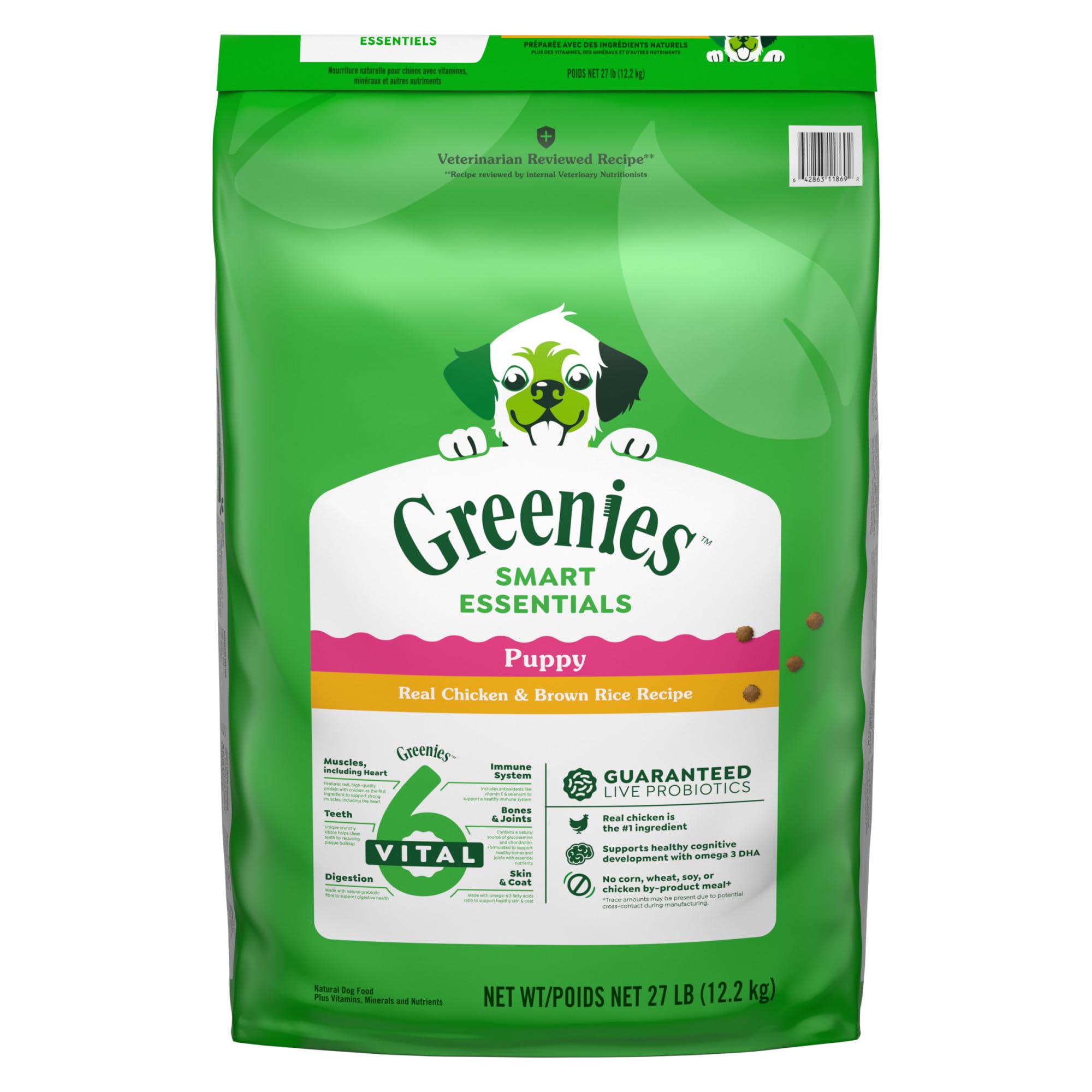 High protein. Supports heathy cognitive development with Omega 3 DHA. Made with natural ingredients plus vitamins, minerals, and nutrients. GREENIES Vital 6: Digestion, Teeth, Skin & Coat, Immune System, Bones & Joints, Muscles, including the Heart. Contains one (1) 12.2kg bag of GREENIES SMART ESSENTIALS Puppy Dry Dog Food Real Chicken and Brown Rice Recipe.