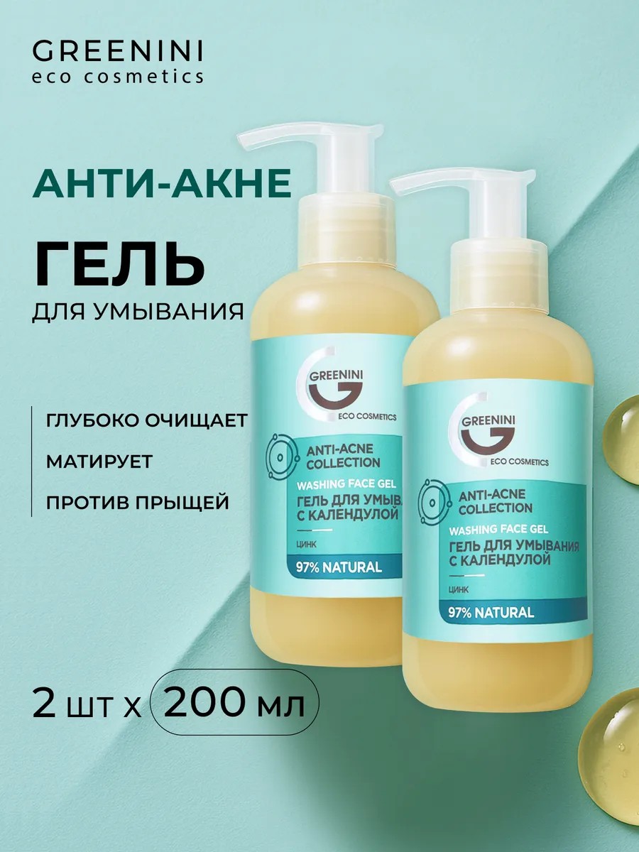 Очищающий гель для умывания с календулой Greenini Anti Acne бережно удаляет ежедневные загрязнения, глубоко очищает поры и снижает интенсивность работы сальных желез, избавляя от прыщей. Цинк подсушивает воспаления и устраняет высыпания на коже лица. Календула оказывает противовоспалительное, успокаивающее и антибактериальное воздействие, нейтрализует жирный блеск и сужает поры. Идеальное средство для ухода за жирной, комбинированной и проблемной кожей, для подростков.