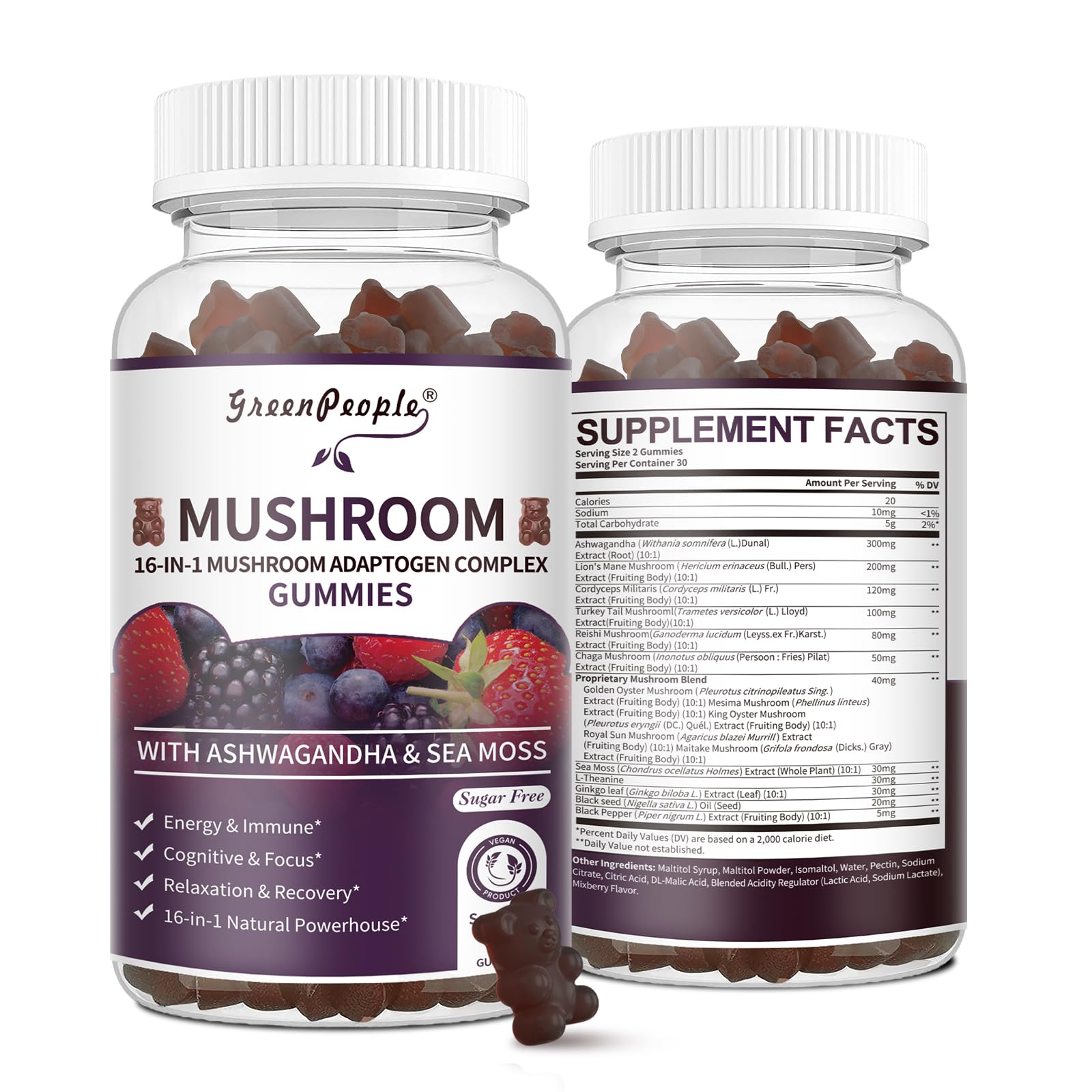 Trusted Quality Dedicated Service: GREENPEOPLE are crafted in GMP-certified facilities to guarantee purity and potency. Within 30 days, if you are not satisfied with our products, please get in touch with us. We are always here to ensure you get the results you deserve. Pure, Premium Ingredients: Our vegan mushroom gummies for adults are Non-GMO, gluten- and dairy-free, with zero artificial additives or preservatives. Their natural ß-glucan stickiness signals high mushroom purity—not chemicals—so you get nothing but the best, clean support in every delicious bite. Mushroom Power for Every Path: From gym-goers and plant-based eaters to busy execs, seniors on the move, night-shift heroes, and weekend adventurers—our gummies fuel your day with steady energy and help your body adapt for whatever life throws at you. Unique Botanical Fusion: Elevate your wellness with our clean, plant-based gummies, a potent blend of Ginkgo Biloba for cognitive support, L-Theanine for stress, and Black Seed Oil's antioxidant power-pure botanical wellness in every sugar-free gummy. 98 Full-Spectrum Mushrooms Nutrition: Our 4-step extraction locks in 98 of active mushroom compounds—far more than the 50 you get elsewhere. We start with 100 whole fruiting bodies, use low-temp supercritical CO2, microencapsulate for digestive protection, and add black pepper for max uptake—just pure mushroom power. 10 Mushroom Blend: Our 10X formula merges Lion's Mane for cognitive clarity, Reishi for immune calm, and Cordyceps for energy, with Turkey Tail, Chaga, Golden King Oyster, Mesima, Royal Sun, and Maitake—Together, these mushrooms work in tandem to support various aspects of your health, from mental clarity to physical vitality. 3X Synergistic Mushroom Adaptogen Blend: Our Mushroom gummies fuse a carefully curated selection of mushrooms, enhanced by Ashwagandha for stress and Sea Moss for 92 minerals. Experience the difference of our 3X Synergistic Formula for yourself and unlock a new level of health and vitality.