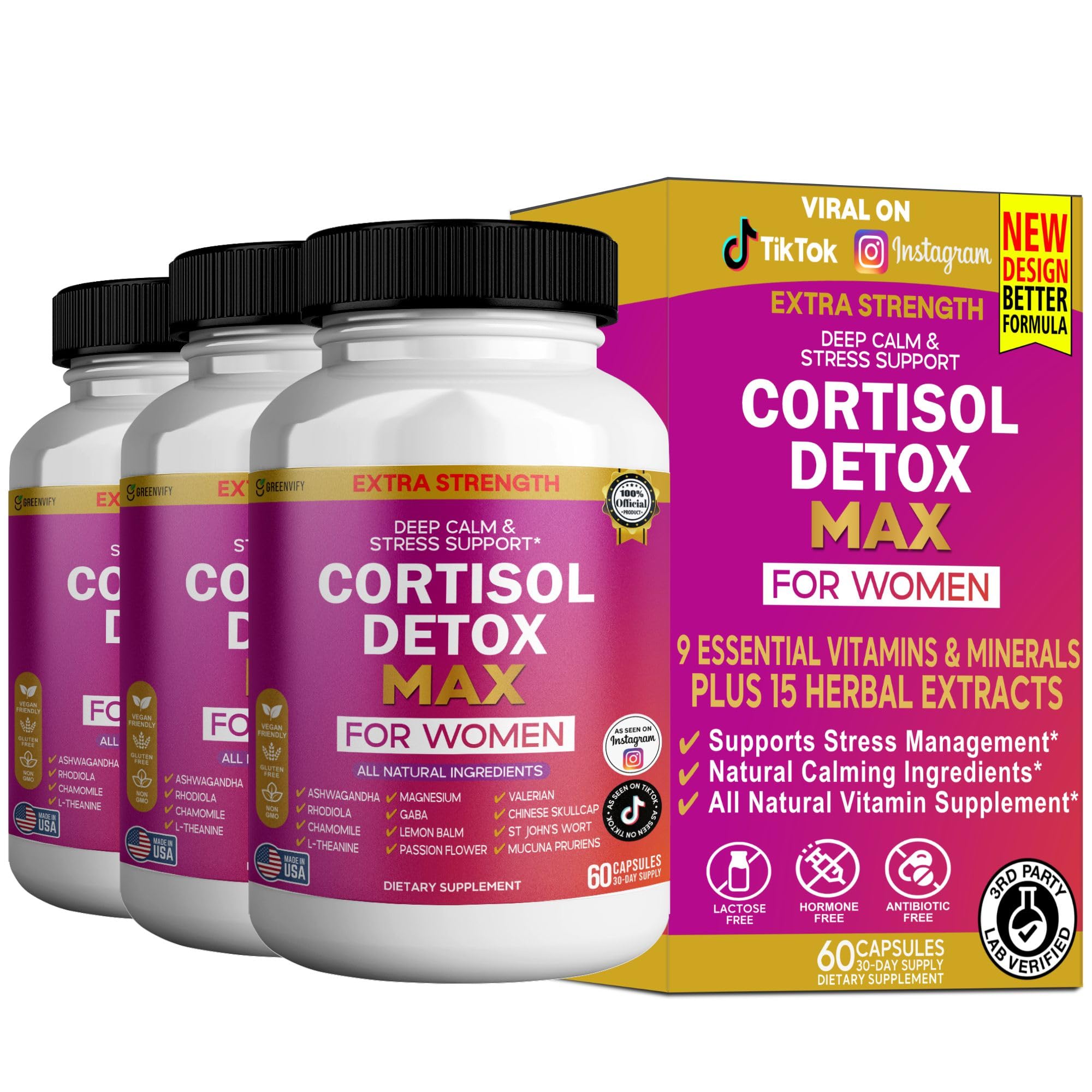 GREENVIFY Cortisol Detox Max for Women Extra Strength Stress Support 60 Capsules 30-Day Supply Ashwagandha Rhodiola Magnesium (3)