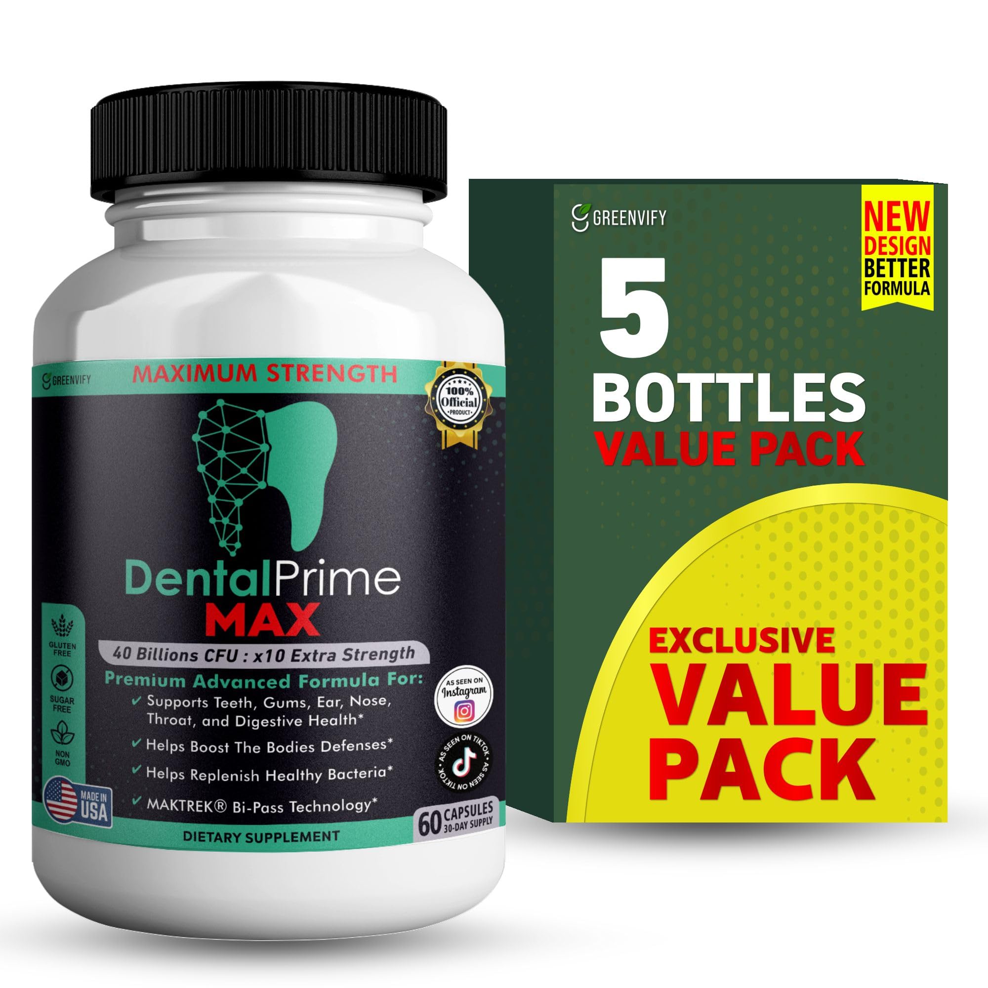 GREENVIFY DentalPrime MAX Probiotic Supplement 40 Billion CFU MAKTREK Bi-Pass Technology 60 Capsules 30-Day Supply (5)