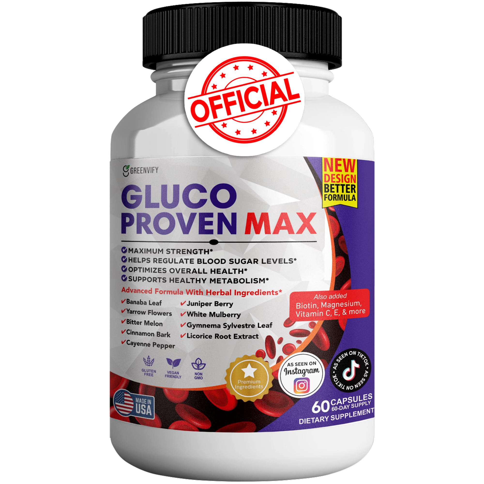 GREENVIFY Gluco Proven Max is a carefully crafted daily wellness supplement featuring a blend of essential vitamins, minerals, and potent botanicals to support your health-conscious lifestyle. With each capsule, you're getting Chromium, Magnesium, Zinc, and a unique herbal combination of Banaba Leaf, Bitter Melon, and Cinnamon, all selected to provide a balanced, holistic approach to wellness. Non-GMO and gluten-free, Gluco Proven Max is ideal for anyone looking to add a natural, reliable supplement to their daily routine. With 60 capsules per bottle, it's convenient, easy to incorporate, and designed to support your journey to everyday vitality.Backed by GREENVIFY Quality Standards GREENVIFY ensures every batch meets strict quality and safety standards. Formulated with a commitment to natural wellness, Gluco Proven Max is a supplement you can trust for consistent quality. Encourages Balanced Vitality With essential vitamins like Vitamin C, E, and B6, along with minerals and herbs, Gluco Proven Max offers balanced nutritional support. This supplement is an ideal partner for wellness enthusiasts looking to enhance their daily routine. Quality-Sourced Ingredients Made from non-GMO, gluten-free ingredients, Gluco Proven Max is a clean, reliable supplement for anyone mindful of their health choices. Each capsule is crafted to provide consistent, high-quality support. Formulated for Active Lifestyles Packed with ingredients like Banaba Leaf, Bitter Melon, and Cinnamon, this formula is tailored for those seeking to maintain an active, health-focused lifestyle. Add this supplement to your daily routine to keep moving and feeling your best. Comprehensive Daily Support Gluco Proven Max by GREENVIFY is a premium blend of vitamins, minerals, and herbal extracts designed to support your overall wellness. Each capsule combines Chromium, Magnesium, and Zinc with powerful botanicals for a balanced daily boost.