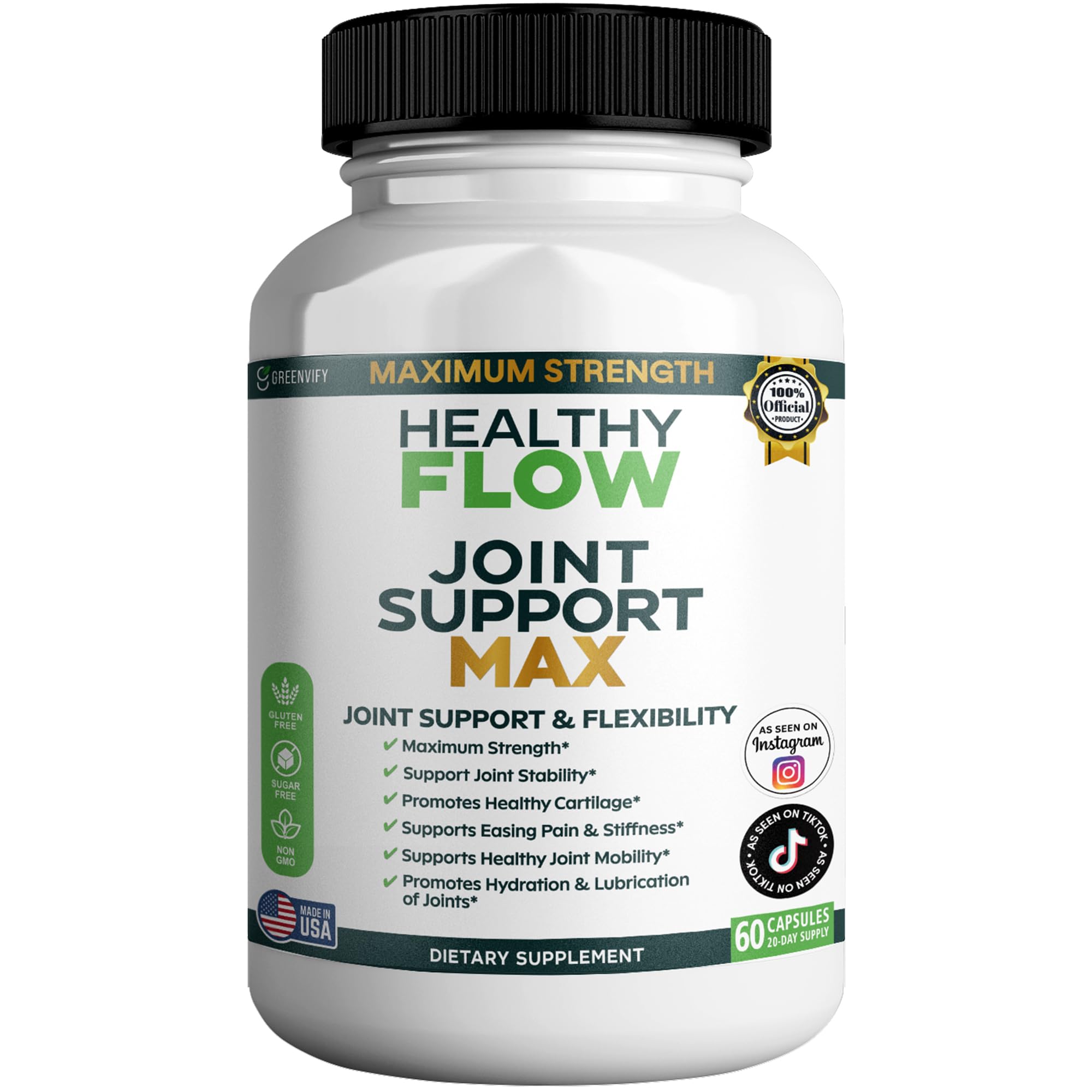 GreenVify Healthy Flow Joint Support Max is designed to keep you moving with comfort and confidence. Packed with 1500mg of Glucosamine per serving, plus Chondroitin, MSM, and Turmeric, this advanced formula helps maintain joint flexibility, support cartilage health, and promote overall mobility. Whether you're staying active in sports, enjoying outdoor adventures, or simply aiming to protect your joints from everyday wear and tear, this supplement offers the targeted support you need. Formulated with premium, non-GMO ingredients and produced in a GMP-certified facility, every capsule is crafted for purity, safety, and effectiveness. With just two easy-to-swallow capsules daily, you can nourish your joints, protect connective tissues, and enjoy a more active, flexible lifestyle. Stay strong, stay mobile, and support your healthy joints with GreenVify Healthy Flow Joint Support Max.Active Lifestyle Support: Helps maintain joint flexibility and strength for daily activities, exercise, and physical performance. Advanced Joint Protection: Comprehensive blend of ingredients works synergistically to support joint comfort and maintain structural integrity. Easy Daily Dosage: Two easy-to-swallow capsules per day provide comprehensive joint support and maintenance for ongoing joint health. Premium Quality Ingredients: Non-GMO ingredients produced in a GMP-certified facility ensuring high standards of purity and effectiveness. Cartilage Tissue Health: Helps nourish and protect joint cartilage while supporting natural collagen production for long-term joint health. Enhanced Mobility Flexibility: Specially formulated to support comfortable movement, reduce stiffness, and enhance overall joint function for active lifestyles. Maximum Joint Support Formula: Each serving delivers 1500mg of Glucosamine combined with Chondroitin, MSM, and Turmeric to help maintain healthy joints, cartilage, and connective tissues.
