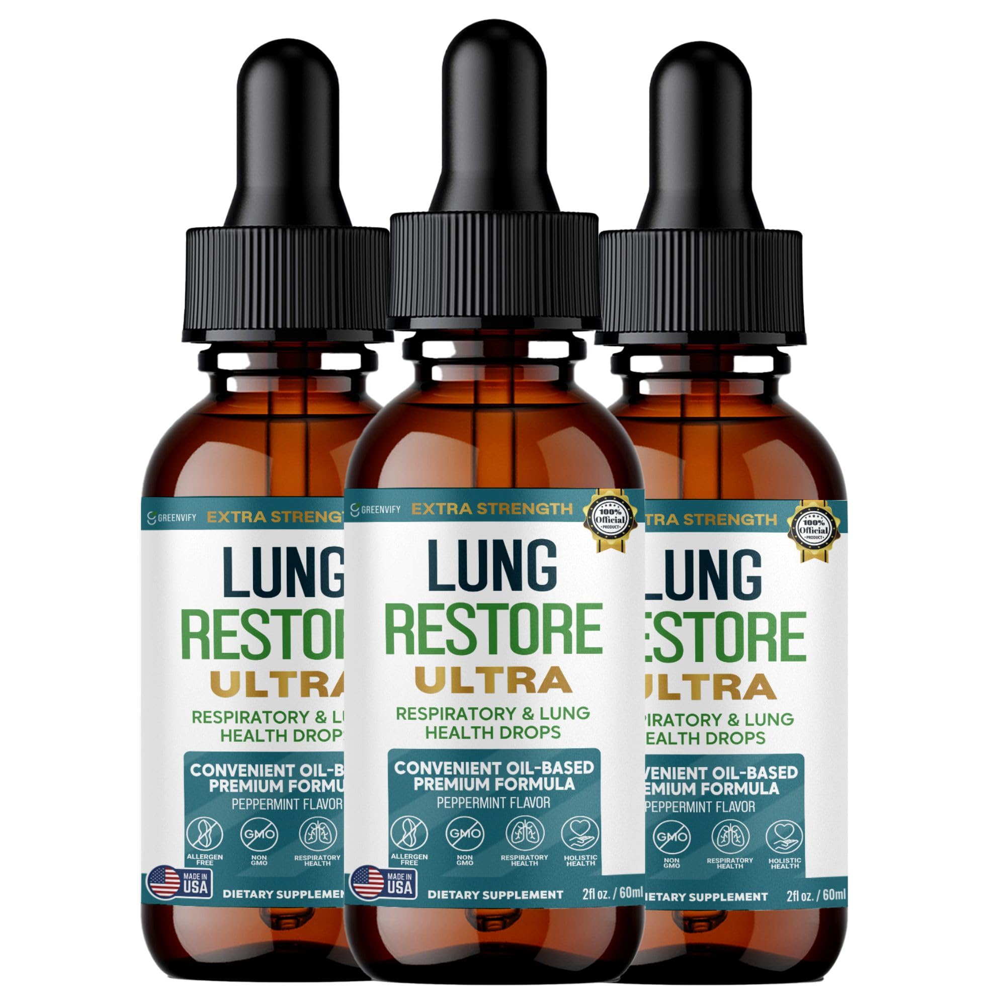 GREENVIFY Lung Restore Ultra Extra Strength Respiratory & Lung Health Drops Peppermint Flavor Oil-Based Formula 2 fl oz 30 Servings (3)