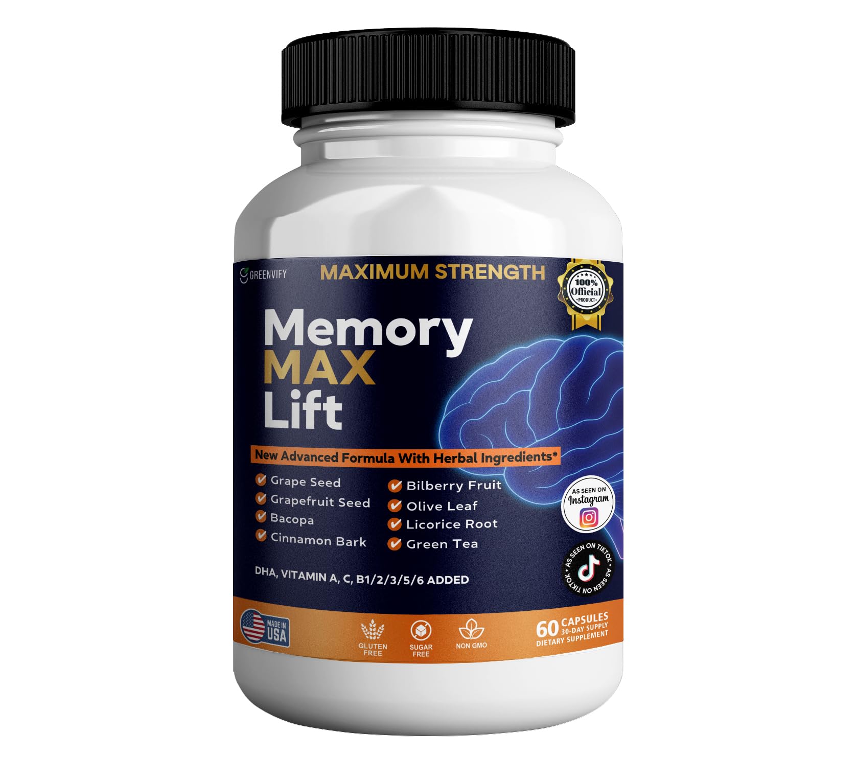 Memory Max Lift – Advanced Nootropic Formula for Brain Power Focus Unlock your mental potential with Memory Max Lift, a comprehensive brain health supplement formulated with natural nootropics, vitamins, minerals, and herbal extracts. Whether you're working, studying, or managing a busy lifestyle, Memory Max Lift helps keep your brain sharp, focused, and energized. Why Choose Memory Max Lift? Supports Memory Clarity – With DMAE, Bacopa Monnieri GABA Boosts Focus Mental Energy – Powered by Green Tea B-Vitamins Herbal Brain Support – Includes Grape Seed, Olive Leaf, Bilberry Fruit more ? Daily Cognitive Protection – With Iron, Magnesium, Zinc, Choline, and Folate Made in USA, Non-GMO – Gluten-free, sugar-free, soy-free, and 100 quality assured This memory and focus booster is ideal for students, professionals, and seniors looking to maintain mental clarity and cognitive balance every day. Fuel your brain, sharpen your edge — with Memory Max Lift by GreenVify.Made in the USA, Trusted Quality – Manufactured under strict GMP guidelines, this non-GMO, gluten-free, and sugar-free supplement is formulated for men and women seeking daily mental edge. . Supports Mood, Focus Energy – With Choline, L-Glutamine, Huperzine A, and Phosphatidylserine, this formula supports neurotransmitter function and cognitive energy without jitters or crashes. . Herbal Nootropic Synergy Blend – Featuring Bilberry Fruit, Olive Leaf, Grape Seed, Grapefruit Seed, Cinnamon Bark, and Licorice Root to promote circulation and reduce mental fatigue naturally. . Full-Spectrum Vitamin Mineral Complex – Includes key brain-nourishing nutrients such as Vitamins A, C, D, E, B1, B2, B6, B12, Biotin, Folate, Iron, Magnesium, Zinc more for optimal neural health. . Maximum Strength Brain Support Formula – Powered by clinically studied ingredients like DMAE, Bacopa, GABA, and Green Tea to enhance memory retention, focus, clarity, and cognitive stamina. .
