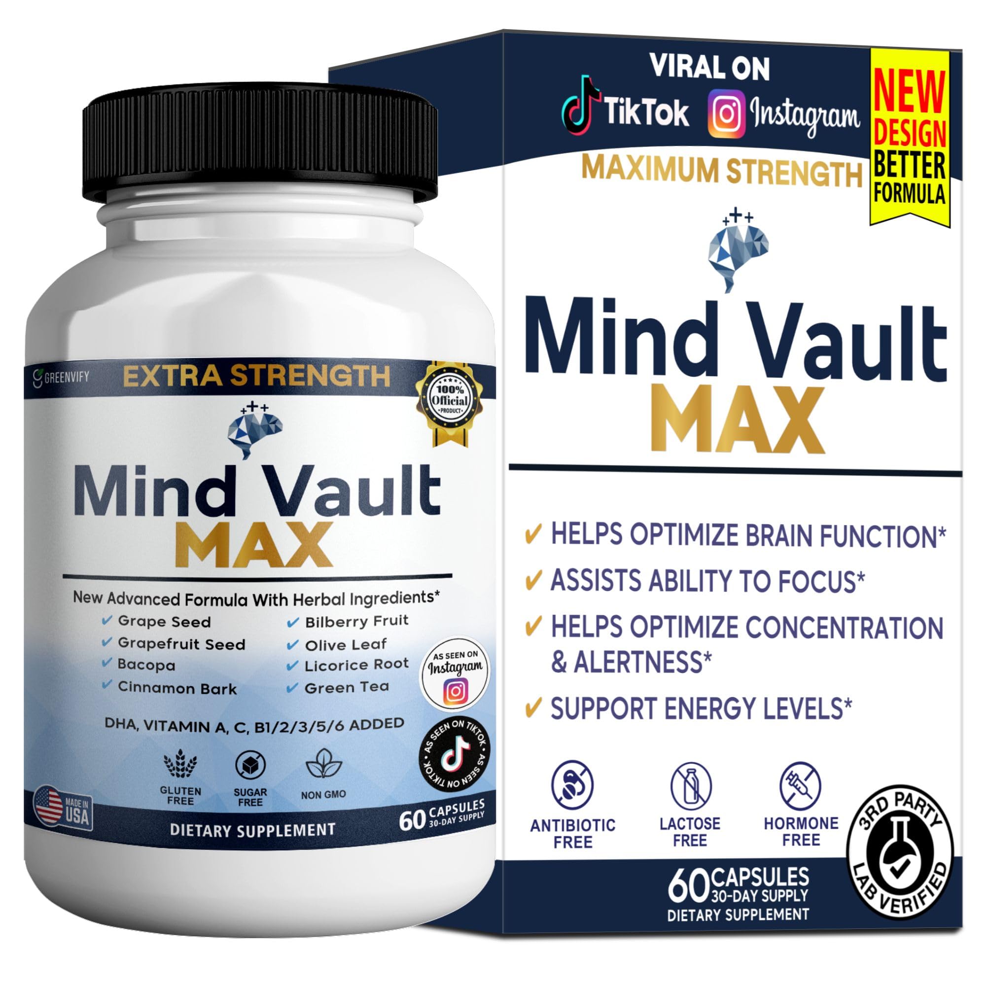 GREENVIFY Mind Vault Max Extra Strength Nootropic Supplement 60 Capsules 30 Day Supply with Herbal Ingredients (1)