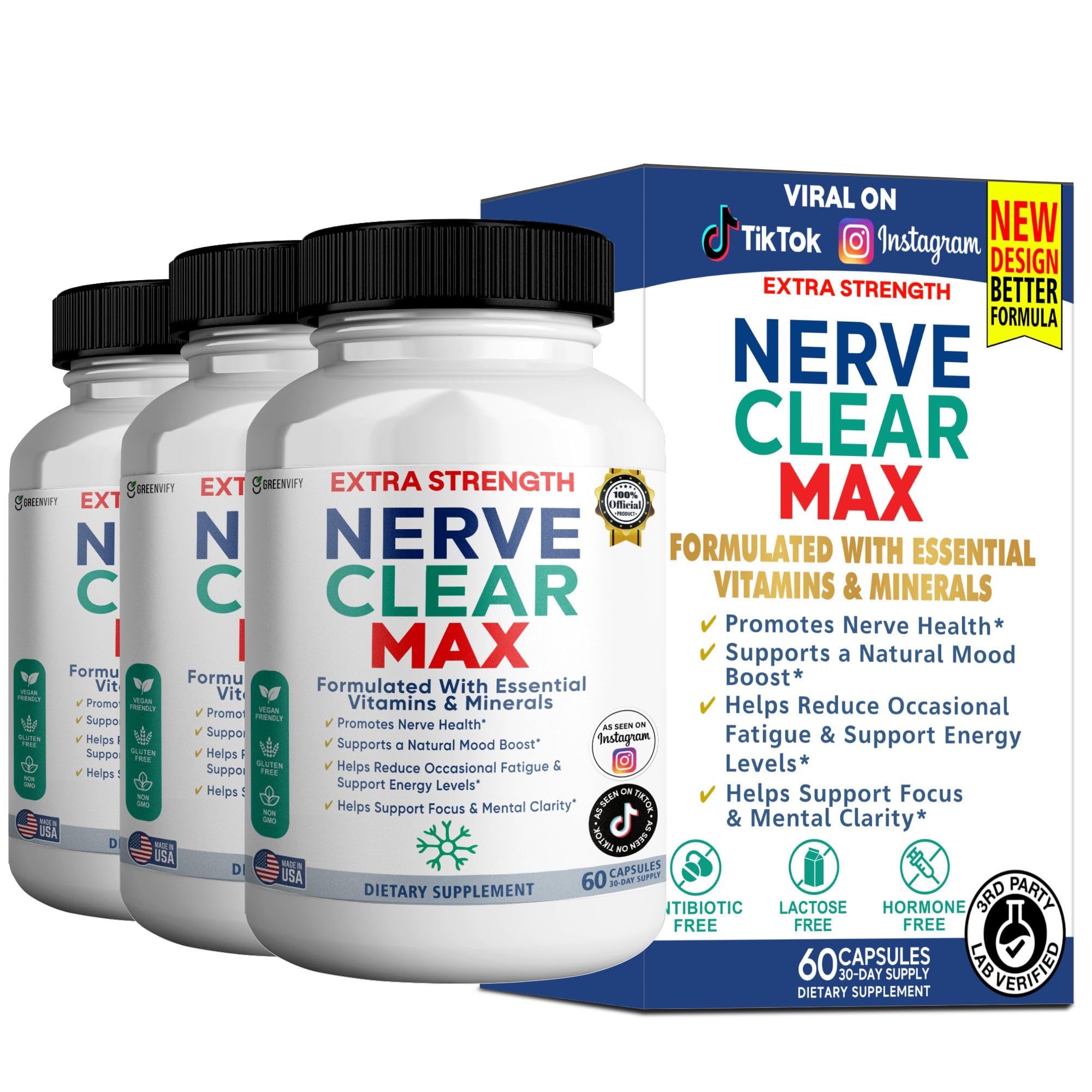 GREENVIFY Nerve Clear Max Extra Strength Essential Vitamins & Minerals Nerve Health Support 60 Capsules 30-Day Supply (3)